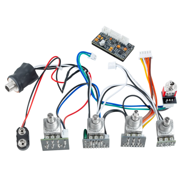 The Sadowsky Onboard Bass Preamp (4-Knob System) is a completely prewired system offering the same controls and the same legendary active preamp as all Sadowsky basses. This preamp is designed for installation on most basses with a 4-Knob Layout. On newer active electric basses with a 4-knob layout with a side jack and a battery compartment, usually no modification is required. On passive basses, the only required modification is to move the output jack to the side of the instrument and to make room for a battery. The controls are: Volume – Pan (Balance) – VTC (Vintage Tone Control) – Treble / Bass. The treble and bass controls are boost only - flat response is with the controls at their complete counterclockwise position. The VTC control is passive, the maximum setting is a flat EQ. The further you turn the control down, the more the high end in the signal will be attenuated. This system is not compatible with active pickups requiring anything else than a 250K or 500K volume or balance pot.