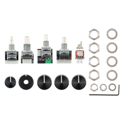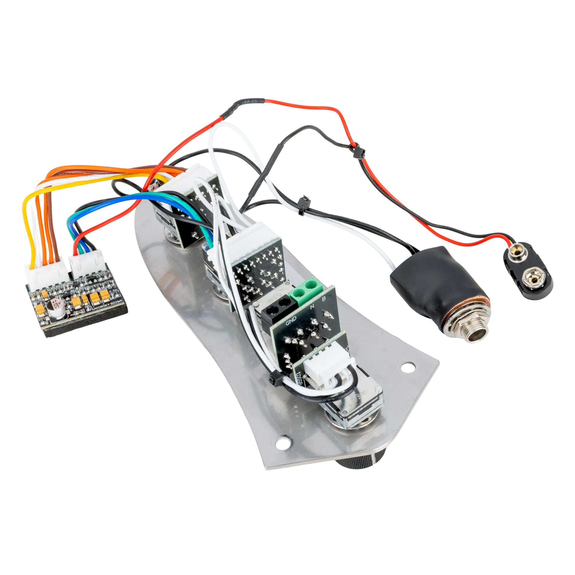 The Sadowsky Onboard Bass Preamp (4-Knob System) is a completely prewired system offering the same controls and the same legendary active preamp as all Sadowsky basses. This preamp is designed for installation on most J-style basses with a metal control plate. On newer active J-style basses with a side jack and a battery compartment, usually no modification is required. On passive basses, the only required modification is to move the output jack to the side of the instrument and to make room for a battery. The controls are: Volume – Pan (Balance) – VTC (Vintage Tone Control) – Treble / Bass. The treble and bass controls are boost only - flat response is with the controls at their complete counterclockwise position. The VTC control is passive, the maximum setting is a flat EQ. The further you turn the control down, the more the high end in the signal will be attenuated. The preamp can be installed either with the included control plate or mounted through a rear control cavity in either a 4-in-line or diamond pattern. This system is not compatible with active pickups requiring anything else than a 250K or 500K volume or balance pot.