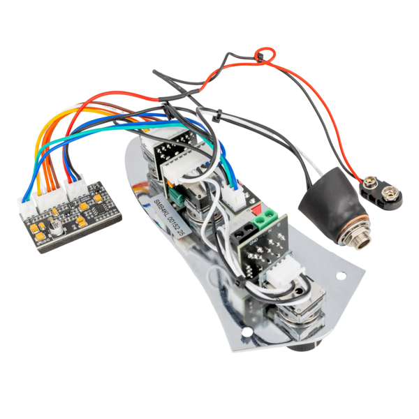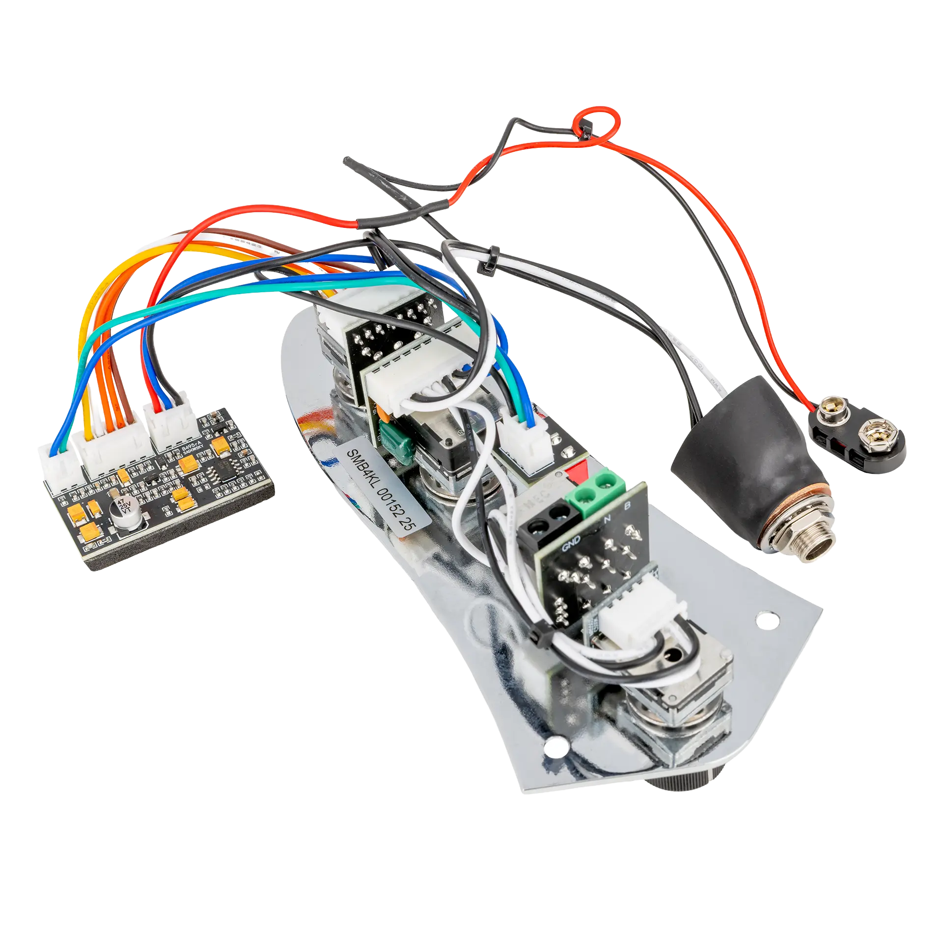 The Sadowsky Onboard Bass Preamp (4-Knob System) is a completely prewired system offering the same controls and the same legendary active preamp as all Sadowsky basses. This preamp is designed for installation on most J-style basses with a metal control plate. On newer active J-style basses with a side jack and a battery compartment, usually no modification is required. On passive basses, the only required modification is to move the output jack to the side of the instrument and to make room for a battery. The controls are: Volume – Pan (Balance) – VTC (Vintage Tone Control) – Treble / Bass – Mid Boost switch. The treble and bass controls are boost only - flat response is with the controls at their complete counterclockwise position. The preamp also features a 500 Hz mid boost that can be switched on/off with a toggle switch. The VTC control is passive, the maximum setting is a flat EQ. The further you turn the control down, the more the high end in the signal will be attenuated. The preamp can be installed either with the included control plate or mounted through a rear control cavity in either a 4-in-line or diamond pattern. This system is not compatible with active pickups requiring anything else than a 250K or 500K volume or balance pot.