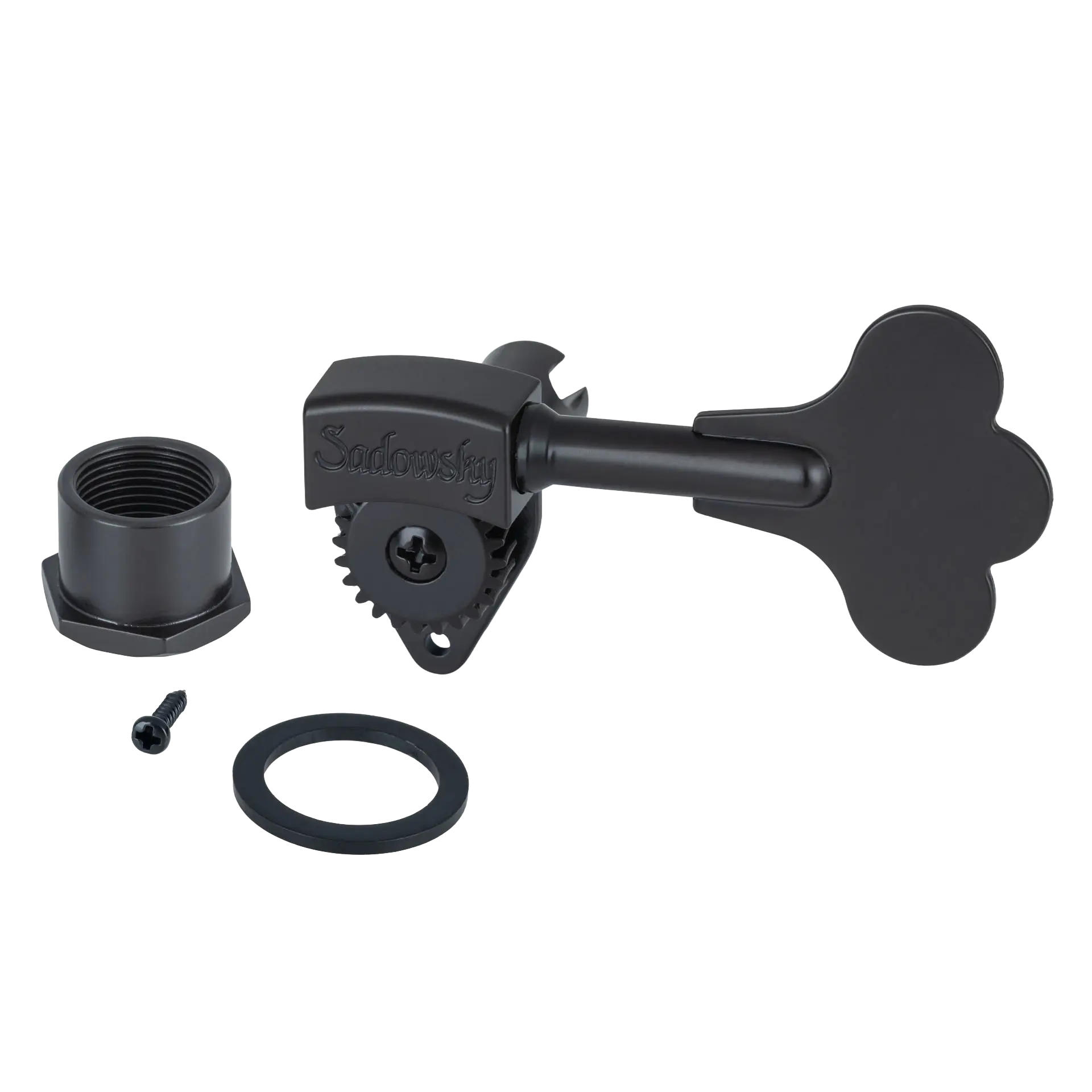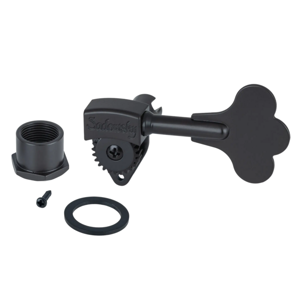 This single machine head comes with all necessary installation accessories: fixing screw, washer, and mounting sleeve, and features a satin black finish to complement your bass hardware.