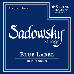 Sadowsky Blue Label electric bass strings (.040" - .125") 5-string set for 35" extra long scale basses, featuring a high-quality Bright Nickel winding and hex core. These strings offer an impressive midrange presence while producing smooth highs and a comfortable feel with less tension. The powerful, aggressive sound of these strings makes them the ideal choice for funk and slap bass.