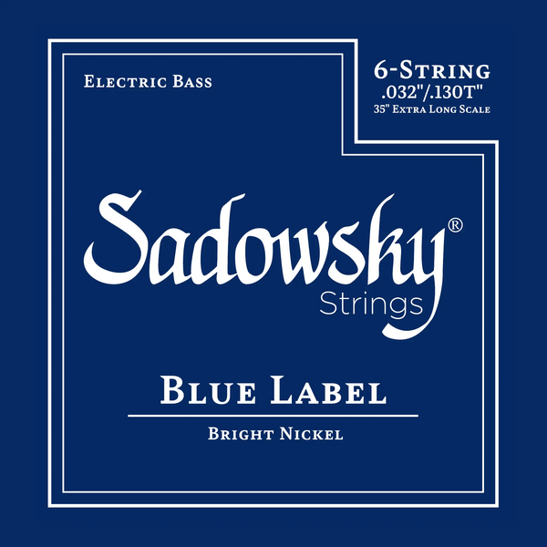 Sadowsky Blue Label (.032" - .130") bright nickel strings for electric bass. 6-string set for 35" extra long scale basses. Bright nickel wrap over a hex core. Improved midrange presence with less brightness and lower tension feel. Cutting and aggressive tone, perfect for funk and slap bass. Designed for top-loading bridges (not recommended for string through bass bodies). Gauges: .032", .045", .065", .085", .105", .130T". Taperwound .130" string.
