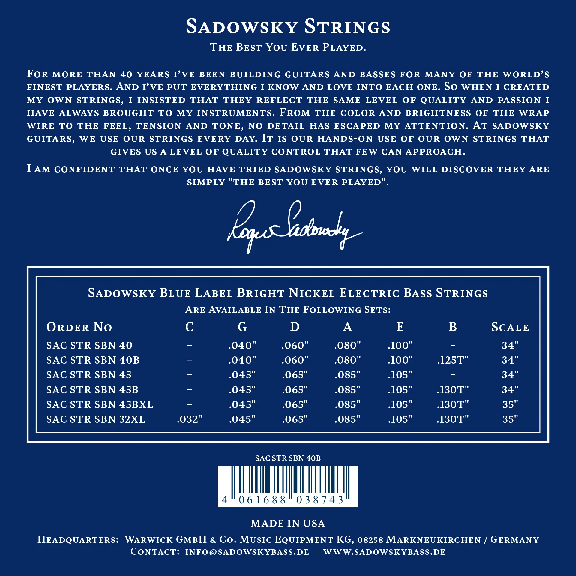 Sadowsky Blue Label Bass String Set, Nickel, Taperwound, Long Scale (34") - 5-String, 040-125