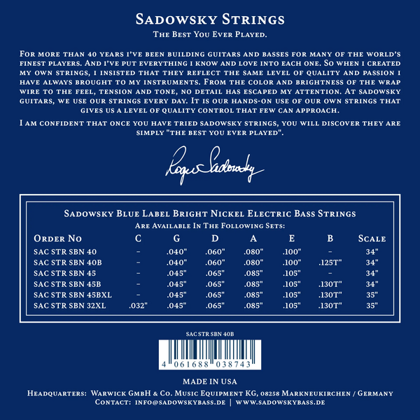Sadowsky Blue Label (.040" - .125T") 5-string set that features a premium Bright Nickel winding and hex core. These strings offer impressive midrange presence while producing smooth highs and a comfortable feel with lower tension. The powerful, aggressive sound of these strings makes them the ideal choice for funk and slap bass.