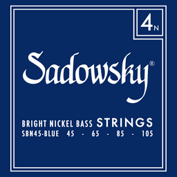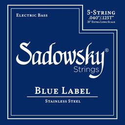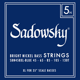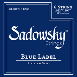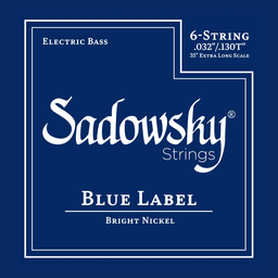 Sadowsky Blue Label electric bass strings (.032" - .130") 6-string set that features a premium Bright Nickel winding and hex core. These strings offer impressive midrange presence while producing smooth highs and a comfortable feel with lower tension. The powerful, aggressive sound of these strings makes them the ideal choice for funk and slap bass.