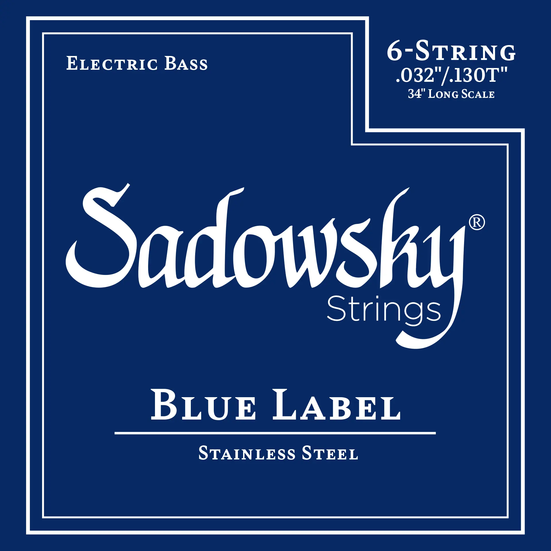 Sadowsky Blue Label electric bass strings (.032" - .130") 6-string set that features a premium stainless steel winding and hex core. These strings offer impressive midrange presence while producing smooth highs and a comfortable feel with lower tension. The powerful, aggressive sound of these strings makes them the ideal choice for funk and slap bass.
