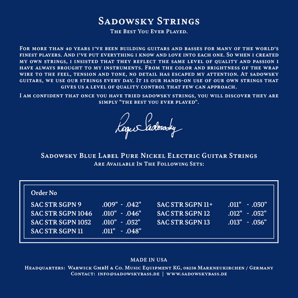 Sadowsky Blue Label Guitar String Set, Pure Nickel - 011-050