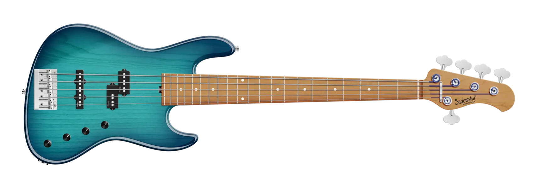 The Sadowsky 21-Fret Verdine White Artist Line bass pays homage to one of the world's best bass players! Featuring a chambered American Swamp Ash body, a Roasted American Maple neck with a Roasted American Maple fingerboard and the famous Sadowsky electronics, you get a bass with that special Sadowsky tone: Never harsh or shrill sounding, with strong, powerful (but never muddy!) bass, mids that are present while not too aggressive, and a sweet and airy treble range. This 5-string version has a P-style body that is finished in a Bora Blue Burst Transparent High Polish finish. Special features include a passive Sadowsky P-style pickup at the neck and a hum-cancelling Sadowsky J-Style pickup at the bridge. The active electronics give you true bypass, treble and bass boost and Vintage Tone Control. It also features light open gear Sadowsky tuners and a Sadowsky Quick String Release Bridge. Made exclusively in our workshop in Germany, a Sadowsky MasterBuilt Verdine White Artist Line bass weighs never more than 8.4 lbs (3.8 kg).