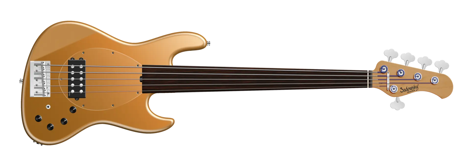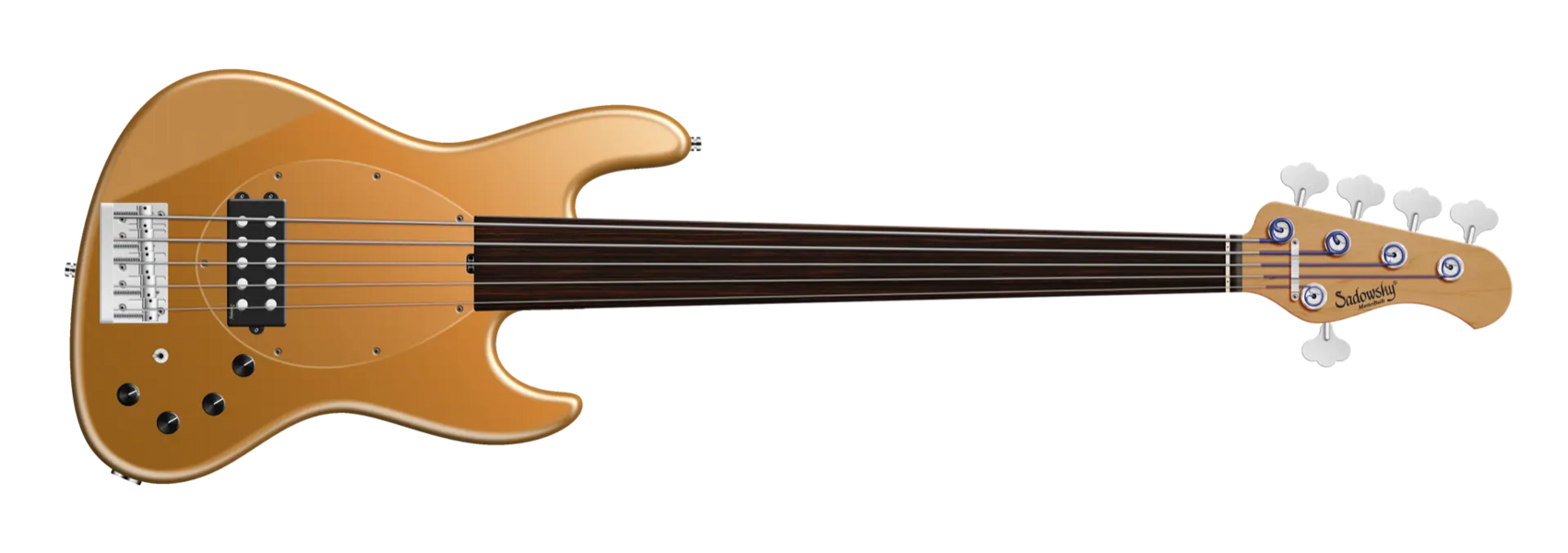 The Sadowsky MasterBuilt 21-Fret Vintage M bass offer the look and feel of a vintage M bass, but with the modern Sadowsky tone. This 5-string fretless bass, seen here in a Solid Firemist Gold Metallic Satin finish, features a sleek, undersized, chambered J-Style body that is made of American Swamp Ash. The neck is made of Roasted American Maple and features a Tigerstripe Ebony fingerboard. Special features of this bass include a passive Sadowsky Quad-Coil Humbucker with Alnico V magnets and active electronics have true bypass, Vintage Tone Control, treble and bass boost, and a 3-way toggle switch for humbucker pickup configuration (series / parallel / single coil). This bass also features light open gear Sadowsky tuners and the Sadowsky Quick String Release Bridge. Each Sadowsky MasterBuilt Vintage M bass is made exclusively in Germany. The weight of this bass is never more than 8.4 lbs (3.8 kg). A good choice for players who want a lightweight bass that offers a modern bass sound.