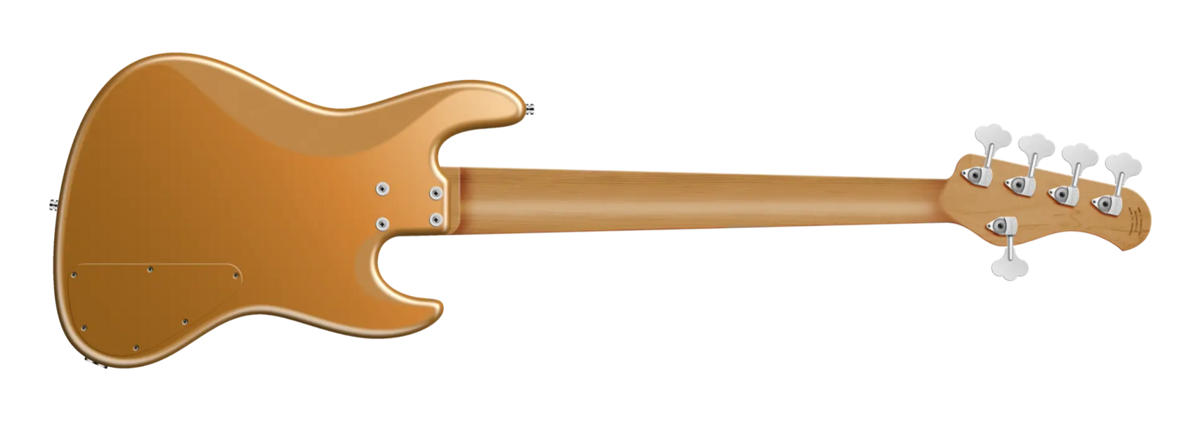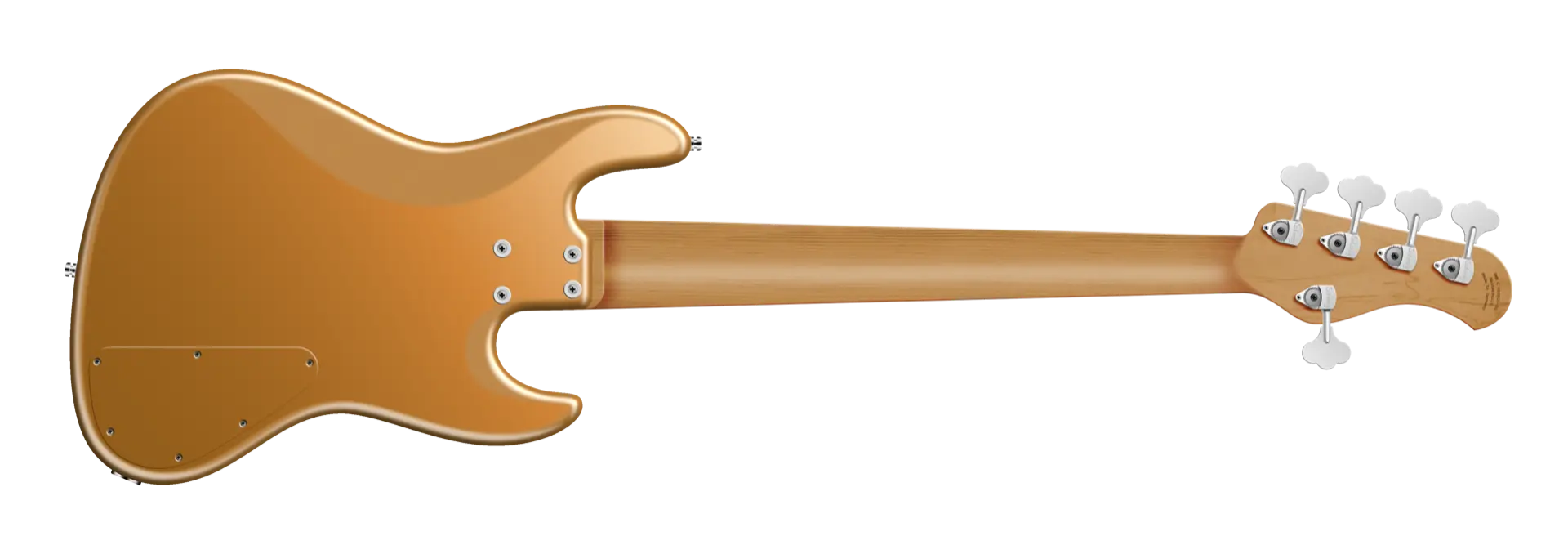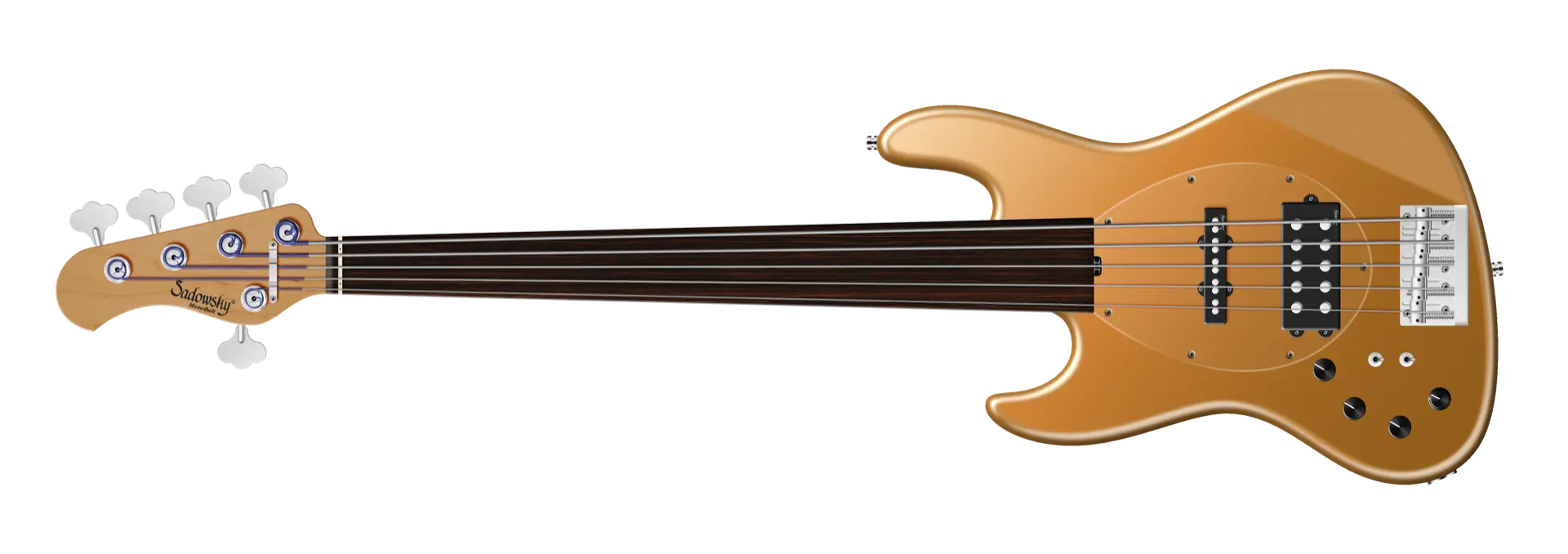 The Sadowsky MasterBuilt 21-Fret Vintage M/J bass offer the looks of a vintage M/J bass, but with that famous modern Sadowsky tone. This 5-string left-hand fretless bass, seen here in a Solid Firemist Gold Metallic Satin finish, features a sleek, undersized, chambered J-Style body that is made of American Swamp Ash. The neck is made of Roasted American Maple and features a Tigerstripe Ebony fingerboard. Special features of this bass include a hum-cancelling Sadowsky J-Style neck pickup and a Sadowsky Quad-Coil Humbucker with Alnico V magnets. The active electronics have true bypass, Vintage Tone Control, treble and bass boost, and two 3-way toggles switch for pickup configuration (series / parallel / single coil). This bass also features light open gear Sadowsky tuners and the Sadowsky Quick String Release Bridge. Sadowsky MasterBuilt 21-Fret Vintage M/J basses are made exclusively in Germany. The weight of this bass is never more than 8.4 lbs (3.8 kg). A good choice for players who want a lightweight bass that offers a modern bass sound.