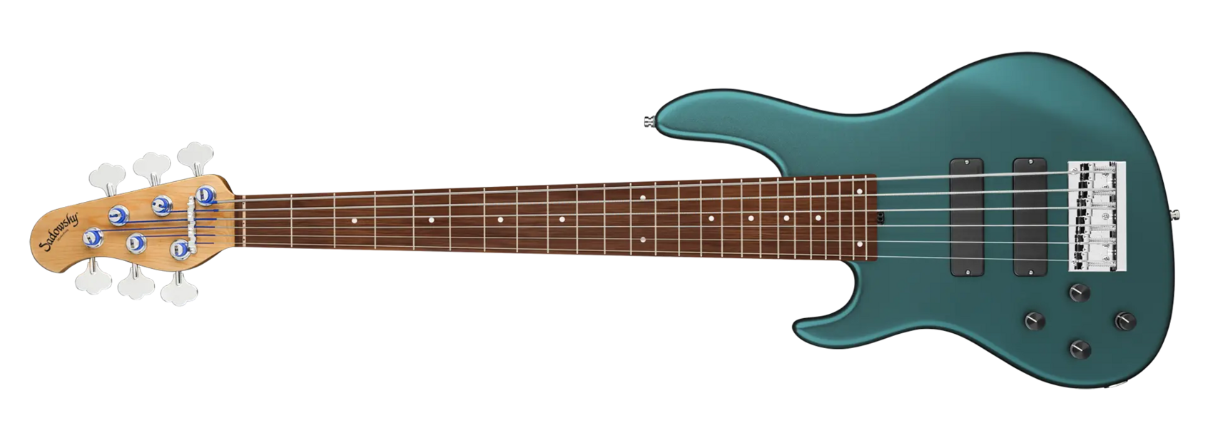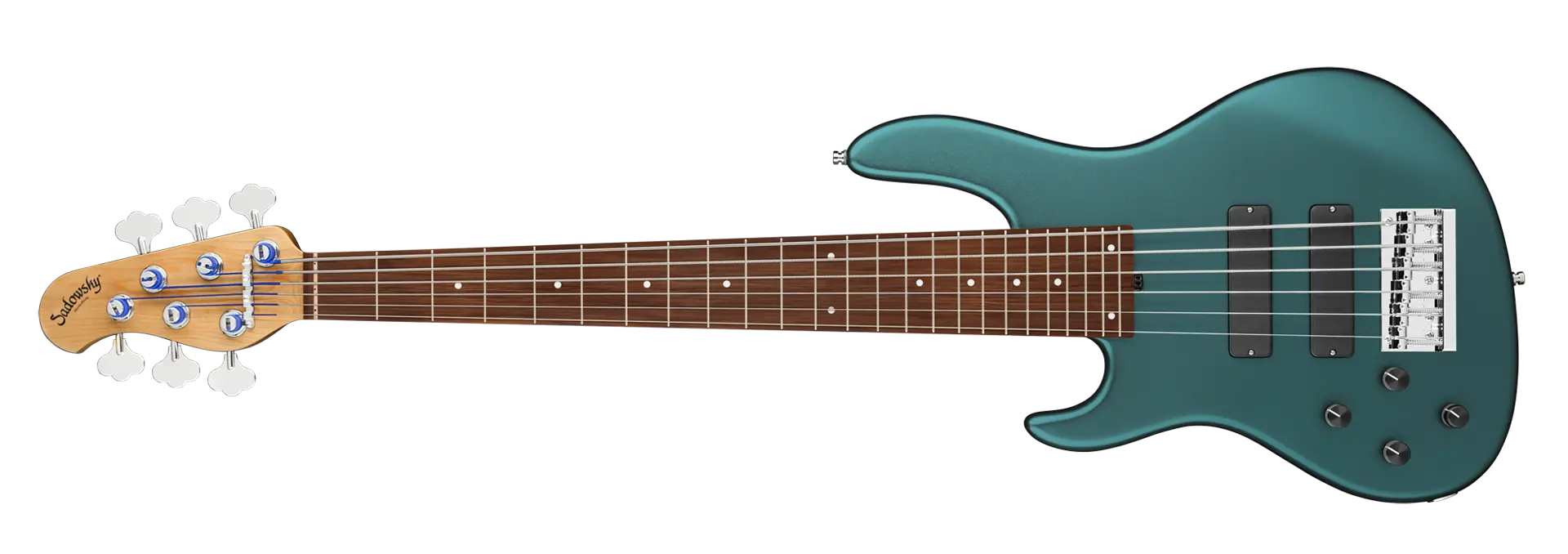 The Sadowsky MasterBuilt 24-Fret Modern Bass is perfect for any player looking for a modern bass with that famous Sadowsky tone: Never harsh or shrill sounding, with strong, powerful but never muddy bass, with present, but not too aggressive mids, and a sweet and airy treble range. This 6-string left-hand bass has a chambered American Red Alder body with a Solid Vintage Teal Green Metallic Satin finish. The body shape is sleek and undersized with deeper cutaways for better playability and a full two octave note range. The neck is made from Roasted American Maple and has a Morado (Pau Ferro) fretboard. This bass is fitted with two passive Sadowsky Soapbar pickups, both in a modern position, and has active electronics that offer true bypass, Vintage Tone Control, as well as treble and bass boost. Hardware includes Sadowsky light open gear tuners and a Sadowsky Quick String Release bridge. Each Sadowsky MasterBuilt 24-Fret Modern Bass is made exclusively in our workshop in Germany and weighs no more than 9.2 lbs (4.17 kg). A good choice for bass players who are seaching for a light, modern looking bass with that special modern Sadowsky sound.
