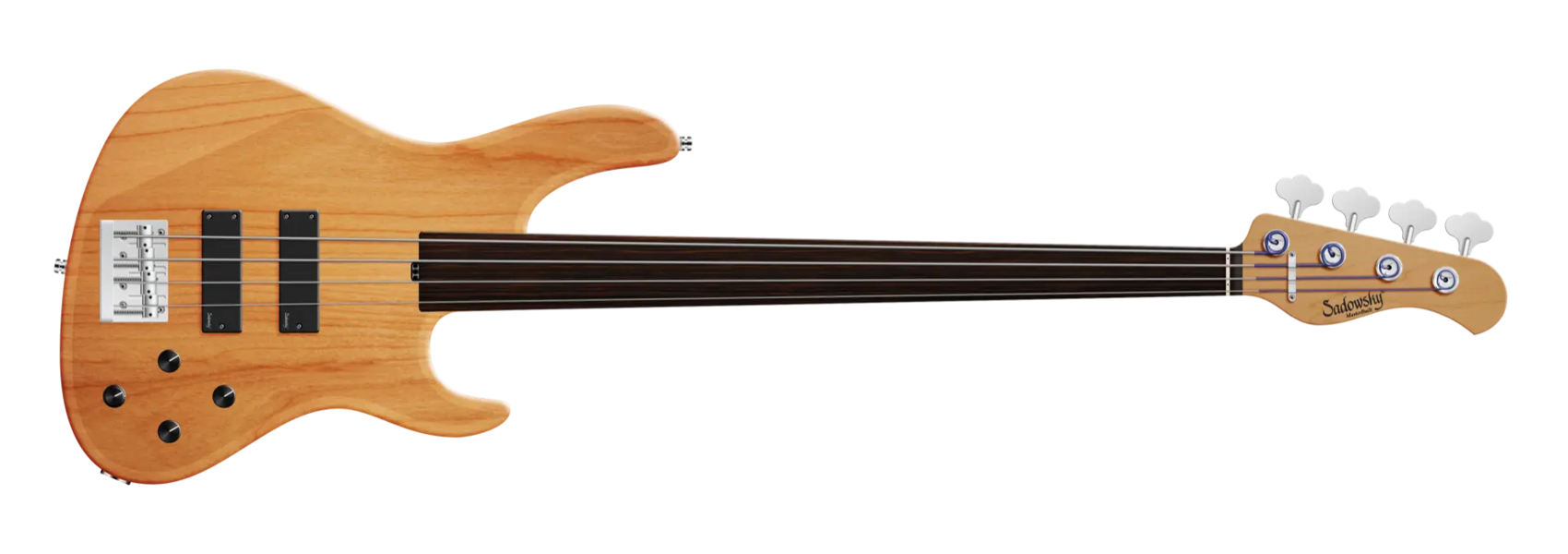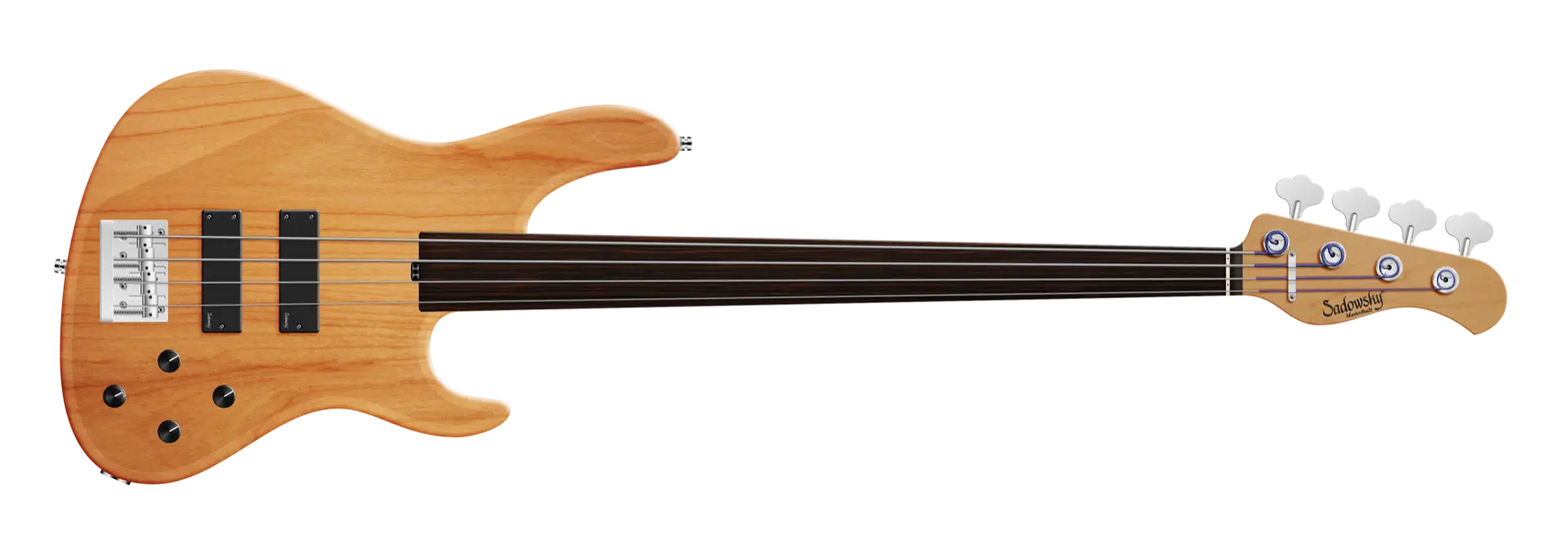The Sadowsky MasterBuilt 24-Fret Modern Bass is perfect for any player looking for a modern bass with that famous Sadowsky tone: Never harsh or shrill sounding, with strong, powerful but never muddy bass, with present, but not too aggressive mids, and a sweet and airy treble range. This 4-string fretless bass has a chambered American Red Alder body with a Natural Transparent Satin finish. The body shape is sleek and undersized with deeper cutaways for better playability and a full two octave note range. The neck is made from Roasted American Maple and has a Tigerstripe Ebony fretboard. This bass is fitted with two passive Sadowsky Soapbar pickups, both in a modern position, and has active electronics that offer true bypass, Vintage Tone Control, as well as treble and bass boost. Hardware includes Sadowsky light open gear tuners and a Sadowsky Quick String Release bridge. Each Sadowsky MasterBuilt 24-Fret Modern Bass is made exclusively in our workshop in Germany and weighs no more than 8.4 lbs (3.8 kg). A good choice for bass players who are seaching for a light, modern looking bass with that special modern Sadowsky sound.