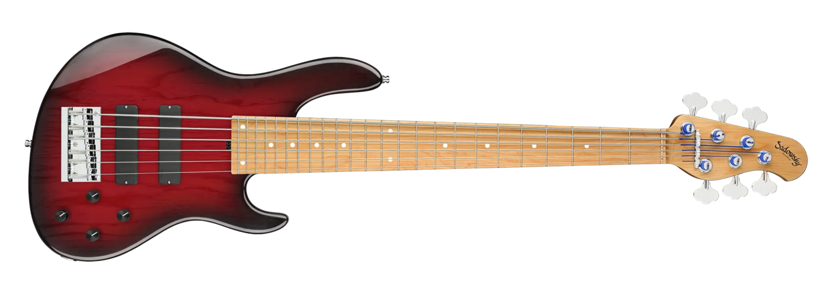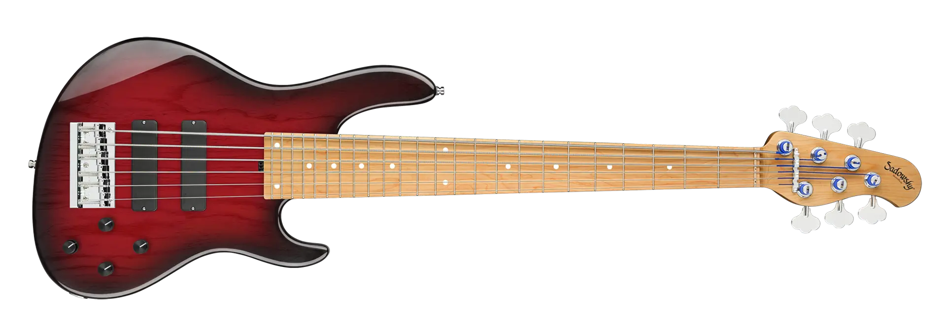 The Sadowsky MasterBuilt 24-Fret Modern Bass is perfect for any player looking for a modern bass with that famous Sadowsky tone: Never harsh or shrill sounding, with strong, powerful but never muddy bass, with present, but not too aggressive mids, and a sweet and airy treble range. This 6-string bass has a chambered American Swamp Ash body with a Burgundy Blackburst Transparent High Polish finish. The body shape is sleek and undersized with deeper cutaways for better playability and a full two octave note range. The neck is made from Roasted American Maple and has a Roasted American Maple fretboard. This bass is fitted with two passive Sadowsky Soapbar pickups, both in a modern position, and has active electronics that offer true bypass, Vintage Tone Control, as well as treble and bass boost. Hardware includes Sadowsky light open gear tuners and a Sadowsky Quick String Release bridge. Each Sadowsky MasterBuilt 24-Fret Modern Bass is made exclusively in our workshop in Germany and weighs no more than 9.2 lbs (4.17 kg). A good choice for bass players who are seaching for a light, modern looking bass with that special modern Sadowsky sound.