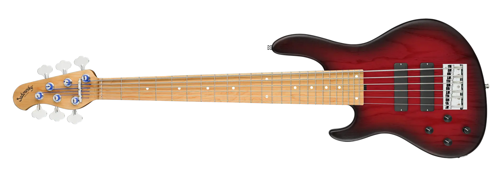 The Sadowsky MasterBuilt 24-Fret Modern Bass is perfect for any player looking for a modern bass with that famous Sadowsky tone: Never harsh or shrill sounding, with strong, powerful but never muddy bass, with present, but not too aggressive mids, and a sweet and airy treble range. This 6-string left-hand bass has a chambered American Swamp Ash body with a Burgundy Blackburst Transparent Satin finish. The body shape is sleek and undersized with deeper cutaways for better playability and a full two octave note range. The neck is made from Roasted American Maple and has a Roasted American Maple fretboard. This bass is fitted with two passive Sadowsky Soapbar pickups, both in a modern position, and has active electronics that offer true bypass, Vintage Tone Control, as well as treble and bass boost. Hardware includes Sadowsky light open gear tuners and a Sadowsky Quick String Release bridge. Each Sadowsky MasterBuilt 24-Fret Modern Bass is made exclusively in our workshop in Germany and weighs no more than 9.2 lbs (4.17 kg). A good choice for bass players who are seaching for a light, modern looking bass with that special modern Sadowsky sound.
