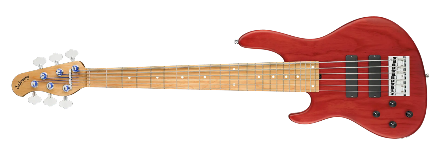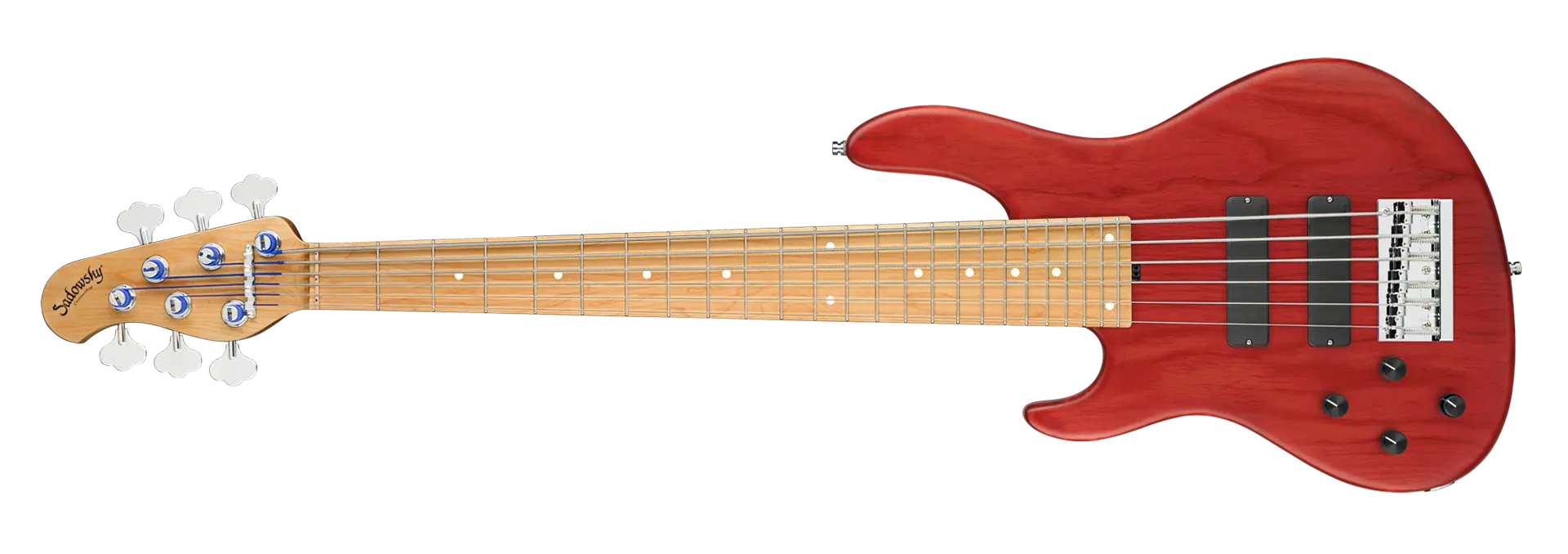 The Sadowsky MasterBuilt 24-Fret Modern Bass is perfect for any player looking for a modern bass with that famous Sadowsky tone: Never harsh or shrill sounding, with strong, powerful but never muddy bass, with present, but not too aggressive mids, and a sweet and airy treble range. This 6-string left-hand bass has a chambered American Swamp Ash body with a Burgundy Red Transparent Satin finish. The body shape is sleek and undersized with deeper cutaways for better playability and a full two octave note range. The neck is made from Roasted American Maple and has a Roasted American Maple fretboard. This bass is fitted with two passive Sadowsky Soapbar pickups, both in a modern position, and has active electronics that offer true bypass, Vintage Tone Control, as well as treble and bass boost. Hardware includes Sadowsky light open gear tuners and a Sadowsky Quick String Release bridge. Each Sadowsky MasterBuilt 24-Fret Modern Bass is made exclusively in our workshop in Germany and weighs no more than 9.2 lbs (4.17 kg). A good choice for bass players who are seaching for a light, modern looking bass with that special modern Sadowsky sound.