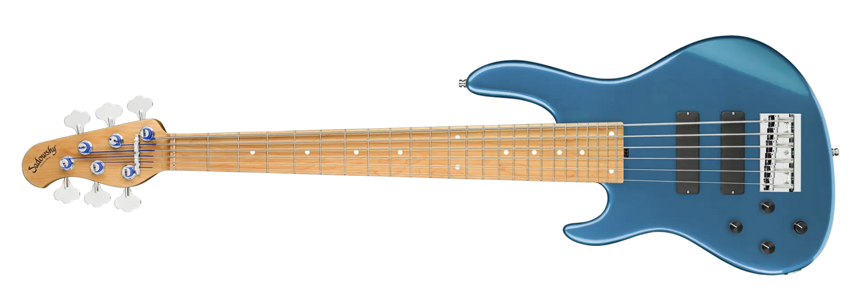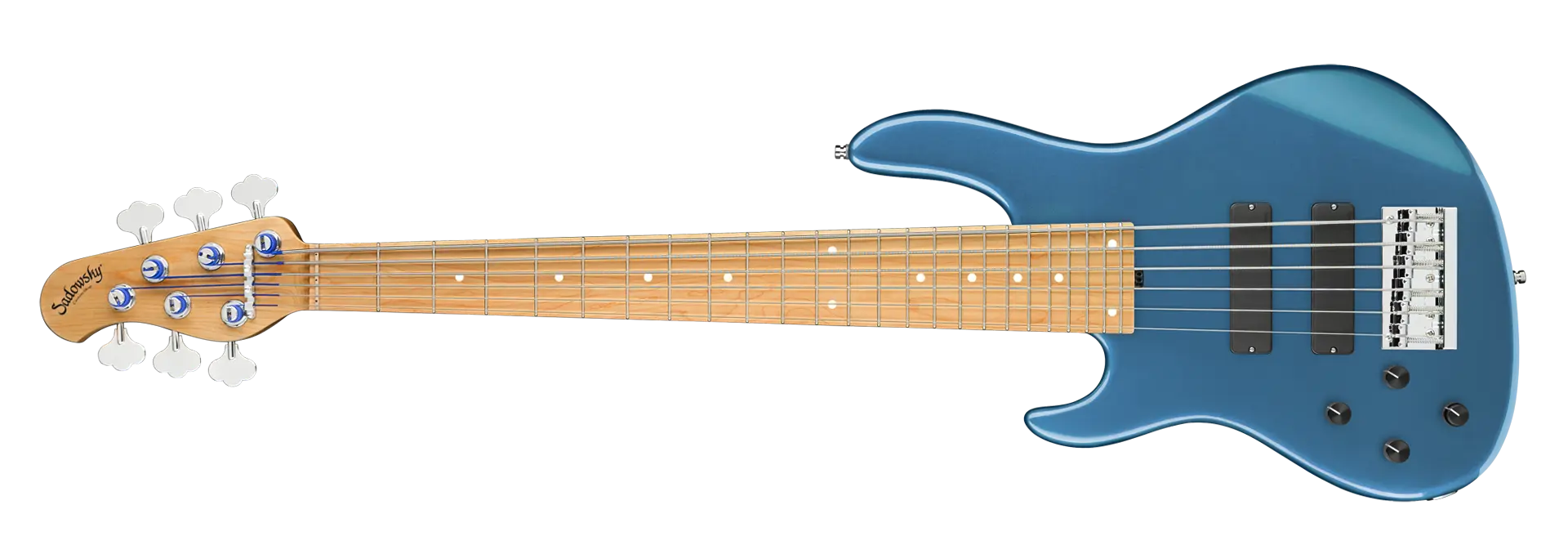 The Sadowsky MasterBuilt 24-Fret Modern Bass is perfect for any player looking for a modern bass with that famous Sadowsky tone: Never harsh or shrill sounding, with strong, powerful but never muddy bass, with present, but not too aggressive mids, and a sweet and airy treble range. This 6-string left-hand bass has a chambered American Swamp Ash body with a Solid Dark Lake Placid Blue Metallic High Polish finish. The body shape is sleek and undersized with deeper cutaways for better playability and a full two octave note range. The neck is made from Roasted American Maple and has a Roasted American Maple fretboard. This bass is fitted with two passive Sadowsky Soapbar pickups, both in a modern position, and has active electronics that offer true bypass, Vintage Tone Control, as well as treble and bass boost. Hardware includes Sadowsky light open gear tuners and a Sadowsky Quick String Release bridge. Each Sadowsky MasterBuilt 24-Fret Modern Bass is made exclusively in our workshop in Germany and weighs no more than 9.2 lbs (4.17 kg). A good choice for bass players who are seaching for a light, modern looking bass with that special modern Sadowsky sound.