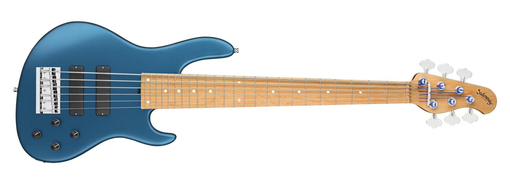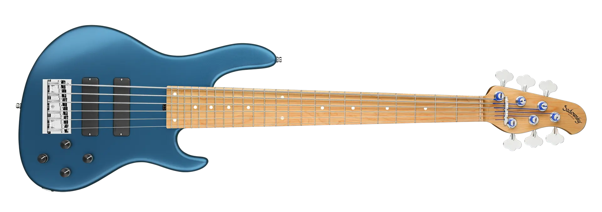 The Sadowsky MasterBuilt 24-Fret Modern Bass is perfect for any player looking for a modern bass with that famous Sadowsky tone: Never harsh or shrill sounding, with strong, powerful but never muddy bass, with present, but not too aggressive mids, and a sweet and airy treble range. This 6-string bass has a chambered American Swamp Ash body with a Solid Dark Lake Placid Blue Metallic Satin finish. The body shape is sleek and undersized with deeper cutaways for better playability and a full two octave note range. The neck is made from Roasted American Maple and has a Roasted American Maple fretboard. This bass is fitted with two passive Sadowsky Soapbar pickups, both in a modern position, and has active electronics that offer true bypass, Vintage Tone Control, as well as treble and bass boost. Hardware includes Sadowsky light open gear tuners and a Sadowsky Quick String Release bridge. Each Sadowsky MasterBuilt 24-Fret Modern Bass is made exclusively in our workshop in Germany and weighs no more than 9.2 lbs (4.17 kg). A good choice for bass players who are seaching for a light, modern looking bass with that special modern Sadowsky sound.