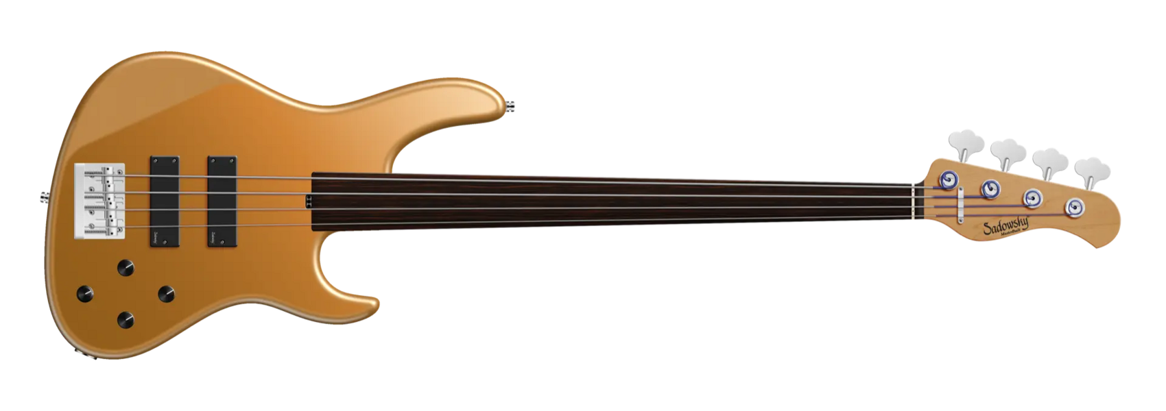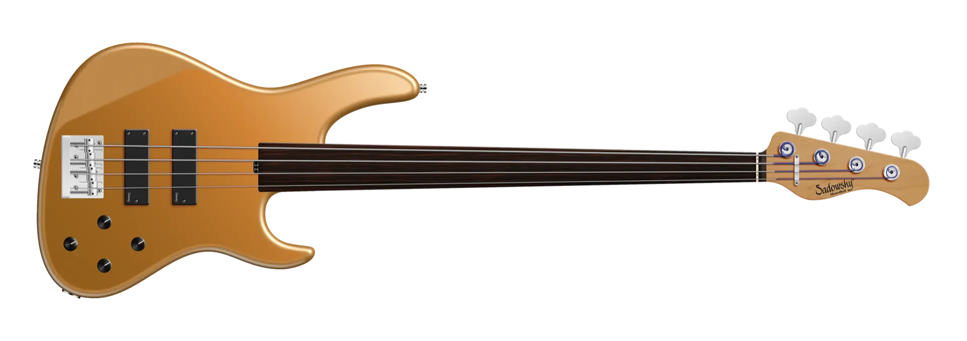 The Sadowsky MasterBuilt 24-Fret Modern Bass is perfect for any player looking for a modern bass with that famous Sadowsky tone: Never harsh or shrill sounding, with strong, powerful but never muddy bass, with present, but not too aggressive mids, and a sweet and airy treble range. This 4-string fretless bass has a chambered American Swamp Ash body with a Solid Firemist Gold Metallic Satin finish. The body shape is sleek and undersized with deeper cutaways for better playability and a full two octave note range. The neck is made from Roasted American Maple and has a Tigerstripe Ebony fretboard. This bass is fitted with two passive Sadowsky Soapbar pickups, both in a modern position, and has active electronics that offer true bypass, Vintage Tone Control, as well as treble and bass boost. Hardware includes Sadowsky light open gear tuners and a Sadowsky Quick String Release bridge. Each Sadowsky MasterBuilt 24-Fret Modern Bass is made exclusively in our workshop in Germany and weighs no more than 8.4 lbs (3.8 kg). A good choice for bass players who are seaching for a light, modern looking bass with that special modern Sadowsky sound.