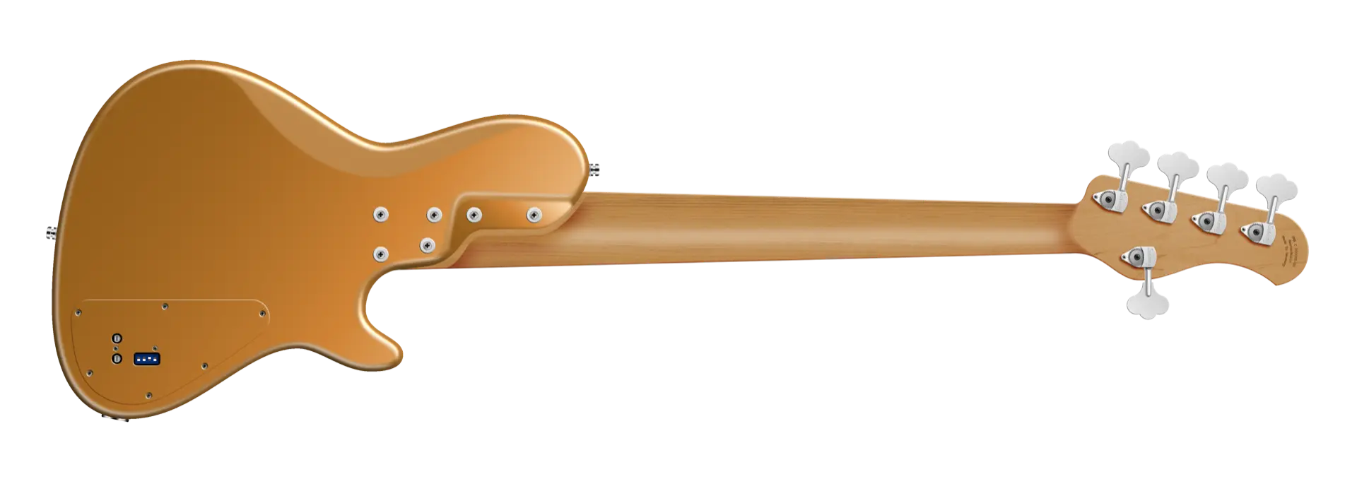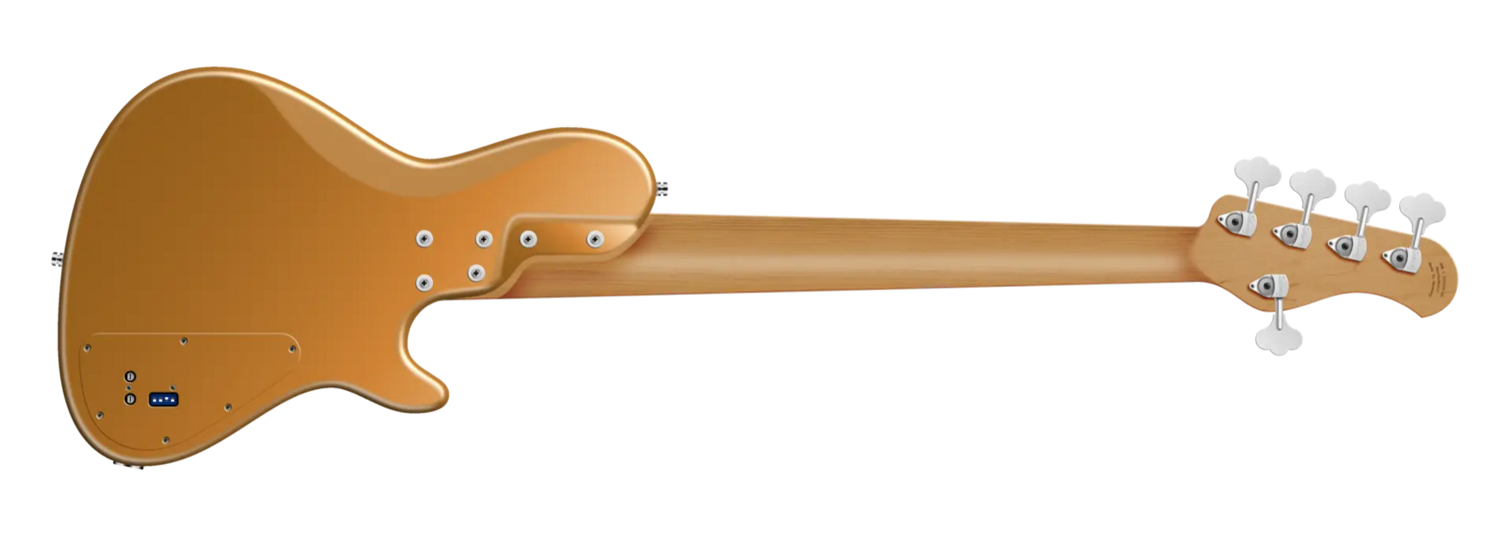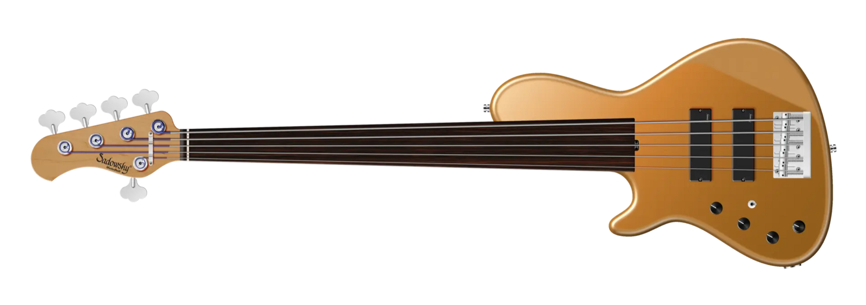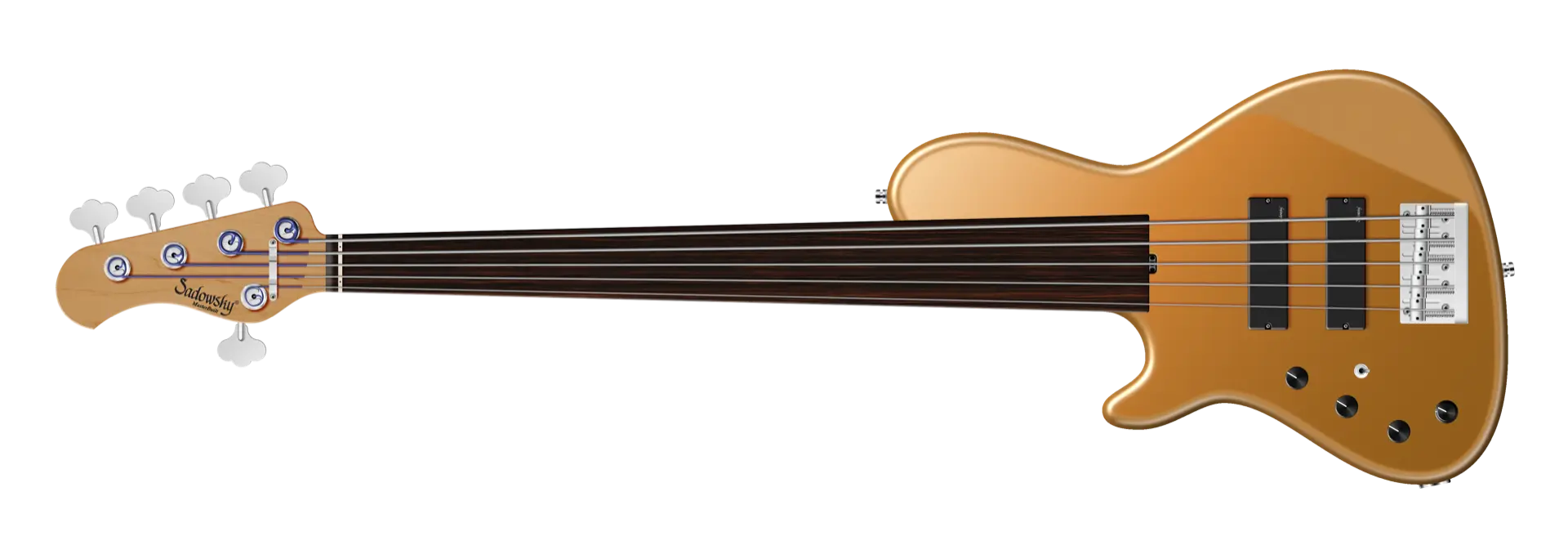 The Sadowsky MasterBuilt 24-Fret Single Cut Bass 5-string left-hand fretless bass features a sleek single-cut style body made of chambered American Swamp Ash with a Solid Firemist Gold Metallic Satin finish. The neck is made of Roasted American Maple and features a Tigerstripe Ebony fingerboard. Special features on this bass include Sadowsky Soapbar pickups as well as Roger's famous electronics featuring a Preamp with switchable mid-boost and trim pot (choice of 500 Hz or 800 Hz, wide or narrow bandwidth), Vintage Tone Control and preamp bypass. Controls include Volume, Balance, VTC (P/P), Treble and Bass. The hardware includes a Sadowsky Quick String Release Bridge and light open gear Sadowsky tuners. Made exclusively in Germany, a Sadowsky MasterBuilt 24-Fret Single Cut bass never weighs more than 8.4 lbs (3.8 kg). It’s a great choice for players who want a lightweight single-cut bass with that famous Sadowsky tone: strong, powerful bass that is never muddy. Mids that are present but not too aggressive and a sweet and airy treble range.