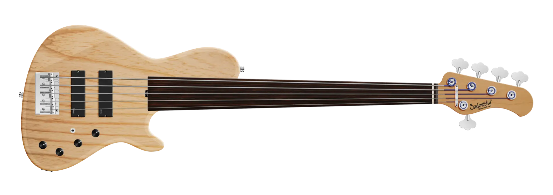 The Sadowsky MasterBuilt 24-Fret Single Cut Bass 5-string fretless bass features a sleek single-cut style body made of chambered American Swamp Ash with a Natural Transparent Satin finish. The neck is made of Roasted American Maple and features a Tigerstripe Ebony fingerboard. Special features on this bass include Sadowsky Soapbar pickups as well as Roger's famous electronics featuring a Preamp with switchable mid-boost and trim pot (choice of 500 Hz or 800 Hz, wide or narrow bandwidth), Vintage Tone Control and preamp bypass. Controls include Volume, Balance, VTC (P/P), Treble and Bass. The hardware includes a Sadowsky Quick String Release Bridge and light open gear Sadowsky tuners. Made exclusively in Germany, a Sadowsky MasterBuilt 24-Fret Single Cut bass never weighs more than 8.4 lbs (3.8 kg). It’s a great choice for players who want a lightweight single-cut bass with that famous Sadowsky tone: strong, powerful bass that is never muddy. Mids that are present but not too aggressive and a sweet and airy treble range.