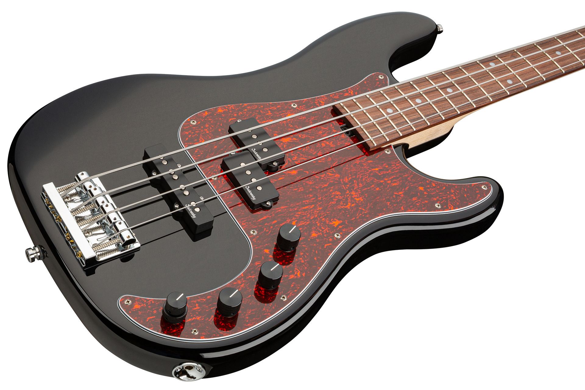 Roger Sadowsky's goal was always to further improve an already very successful bass design by making a number of detailed improvements. Along with the electronics, which he developed by himself, he succeeded to raise the well-known P/J bass sound to a new level, so today you can speak of a typical Sadowsky tone: Never harsh or shrill sounding, with strong, powerful but never muddy bass, with present, but not too aggressive mids, and a sweet and airy treble range. This modern bass sound can also be found in the Sadowsky MetroLine 21-Fret Hybrid P/J line of basses. This 4-string bass, seen here in a Solid Black High Polish finish, features a chambered P-Style body made of American Red Alder. The neck is made of Maple and features a Morado (Pau Ferro) fingerboard. Special features of this bass include Sadowsky P and J pickups, active electronics with true bypass, Vintage Tone Control, treble and bass boost. This bass also features light open gear Sadowsky tuners and the Sadowsky Quick String Release Bridge. Sadowsky MetroLine 21-Fret Hybrid P/J basses are made exclusively in Germany. The weight of this bass is never more than 8.9 lbs (4.0 kg). A good choice for players who want a lightweight bass that offers a modern bass sound.