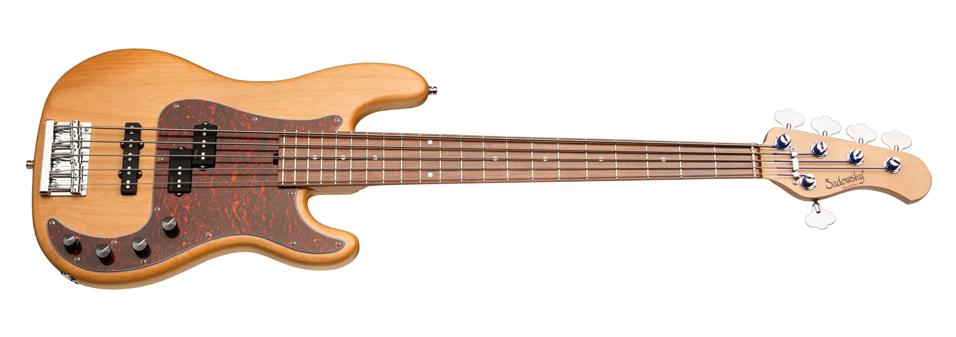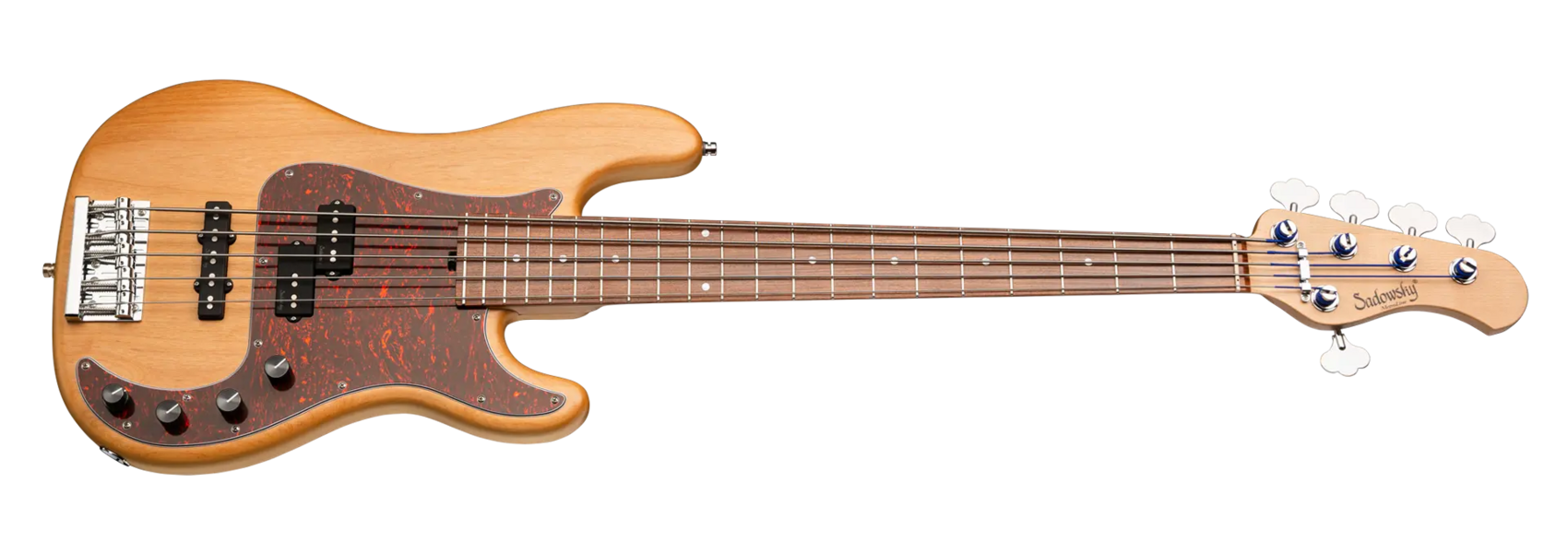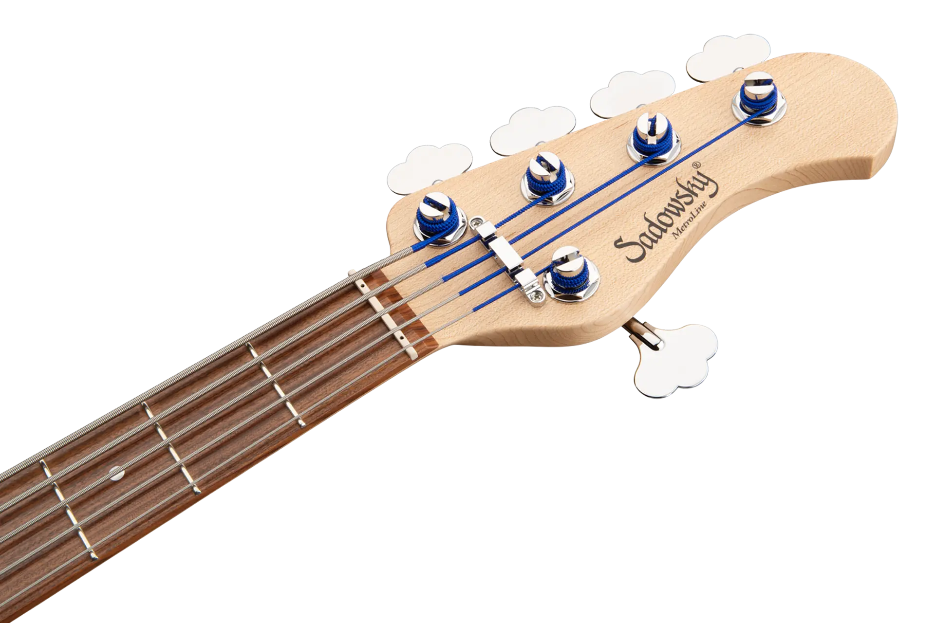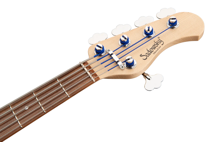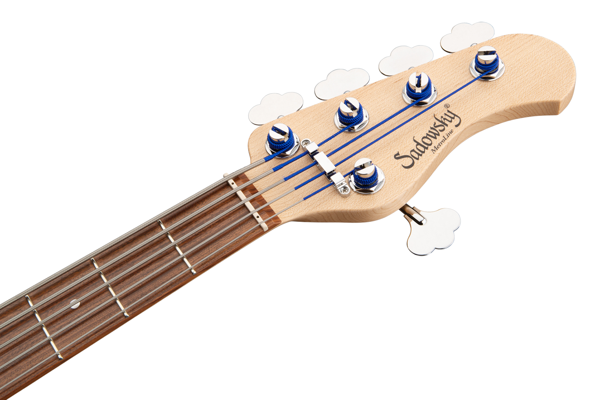 Roger Sadowsky's goal was always to further improve an already very successful bass design by making a number of detailed improvements. Along with the electronics, which he developed by himself, he succeeded to raise the well-known P/J bass sound to a new level, so today you can speak of a typical Sadowsky tone: Never harsh or shrill sounding, with strong, powerful but never muddy bass, with present, but not too aggressive mids, and a sweet and airy treble range. This modern bass sound can also be found in the Sadowsky MetroLine 21-Fret Hybrid P/J line of basses. This 5-string bass, seen here in a Natural Transparent Satin finish, features a chambered P-Style body made of American Red Alder. The neck is made of Maple and features a Morado (Pau Ferro) fingerboard. Special features of this bass include Sadowsky P and J pickups, active electronics with true bypass, Vintage Tone Control, treble and bass boost. This bass also features light open gear Sadowsky tuners and the Sadowsky Quick String Release Bridge. Sadowsky MetroLine 21-Fret Hybrid P/J basses are made exclusively in Germany. The weight of this bass is never more than 8.9 lbs (4.0 kg). A good choice for players who want a lightweight bass that offers a modern bass sound.