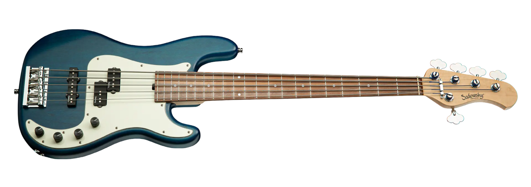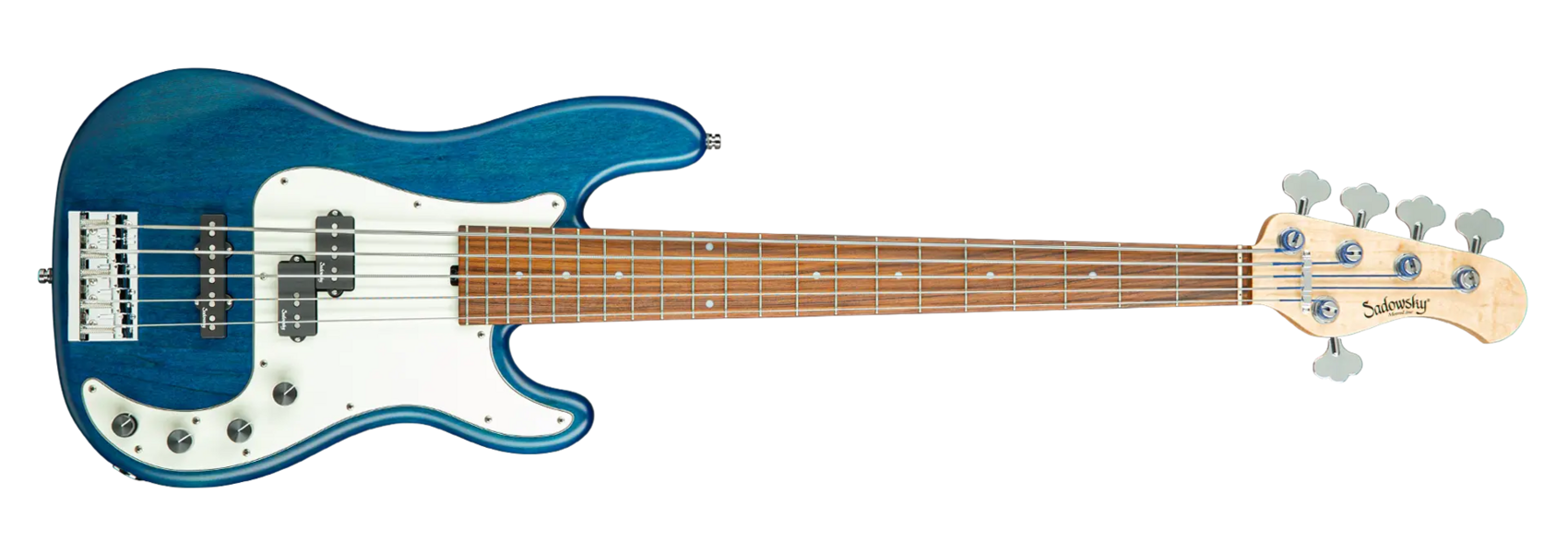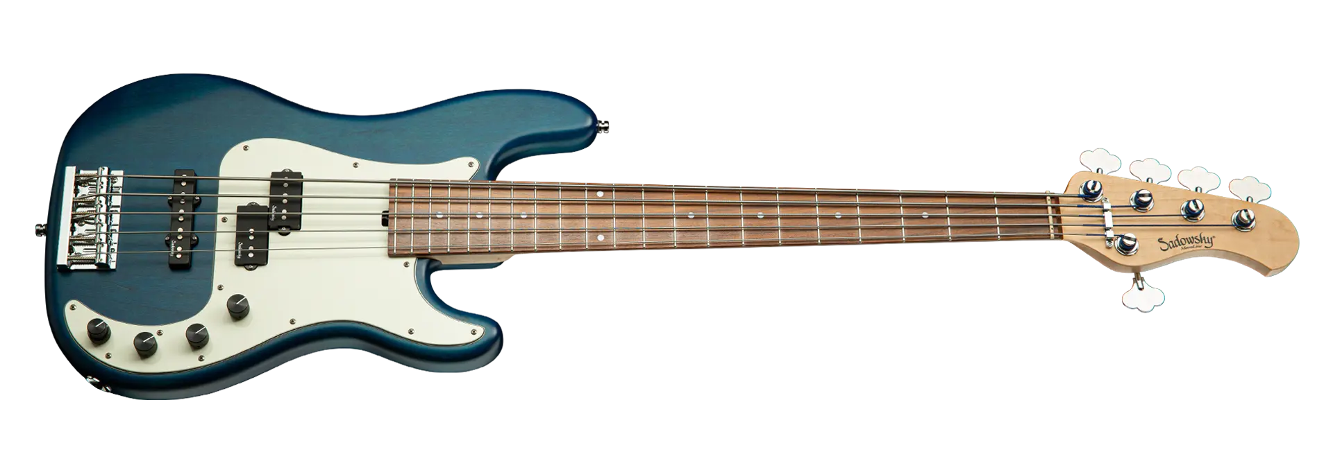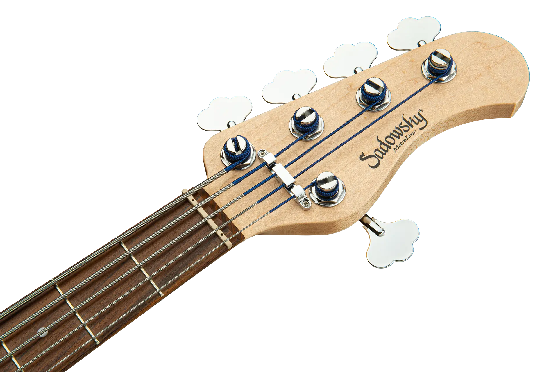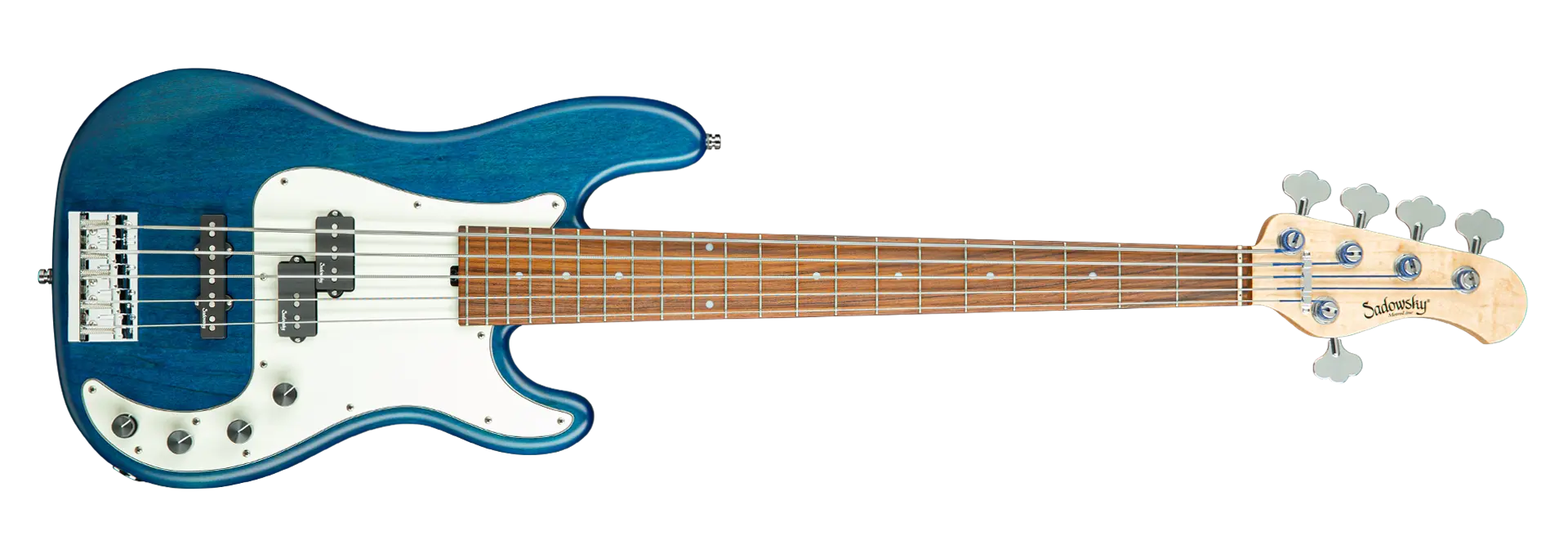 Roger Sadowsky's goal was always to further improve an already very successful bass design by making a number of detailed improvements. Along with the electronics, which he developed by himself, he succeeded to raise the well-known P/J bass sound to a new level, so today you can speak of a typical Sadowsky tone: Never harsh or shrill sounding, with strong, powerful but never muddy bass, with present, but not too aggressive mids, and a sweet and airy treble range. This modern bass sound can also be found in the Sadowsky MetroLine 21-Fret Hybrid P/J line of basses. This 5-string bass, seen here in an Ocean Blue Transparent Satin finish, features a chambered P-Style body made of American Red Alder. The neck is made of Maple and features a Morado (Pau Ferro) fingerboard. Special features of this bass include Sadowsky P and J pickups, active electronics with true bypass, Vintage Tone Control, treble and bass boost. This bass also features light open gear Sadowsky tuners and the Sadowsky Quick String Release Bridge. Sadowsky MetroLine 21-Fret Hybrid P/J basses are made exclusively in Germany. The weight of this bass is never more than 8.9 lbs (4.0 kg). A good choice for players who want a lightweight bass that offers a modern bass sound.