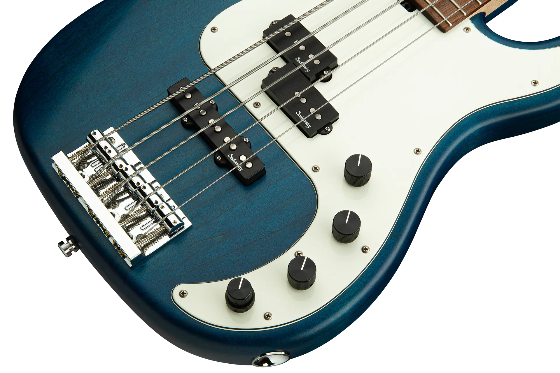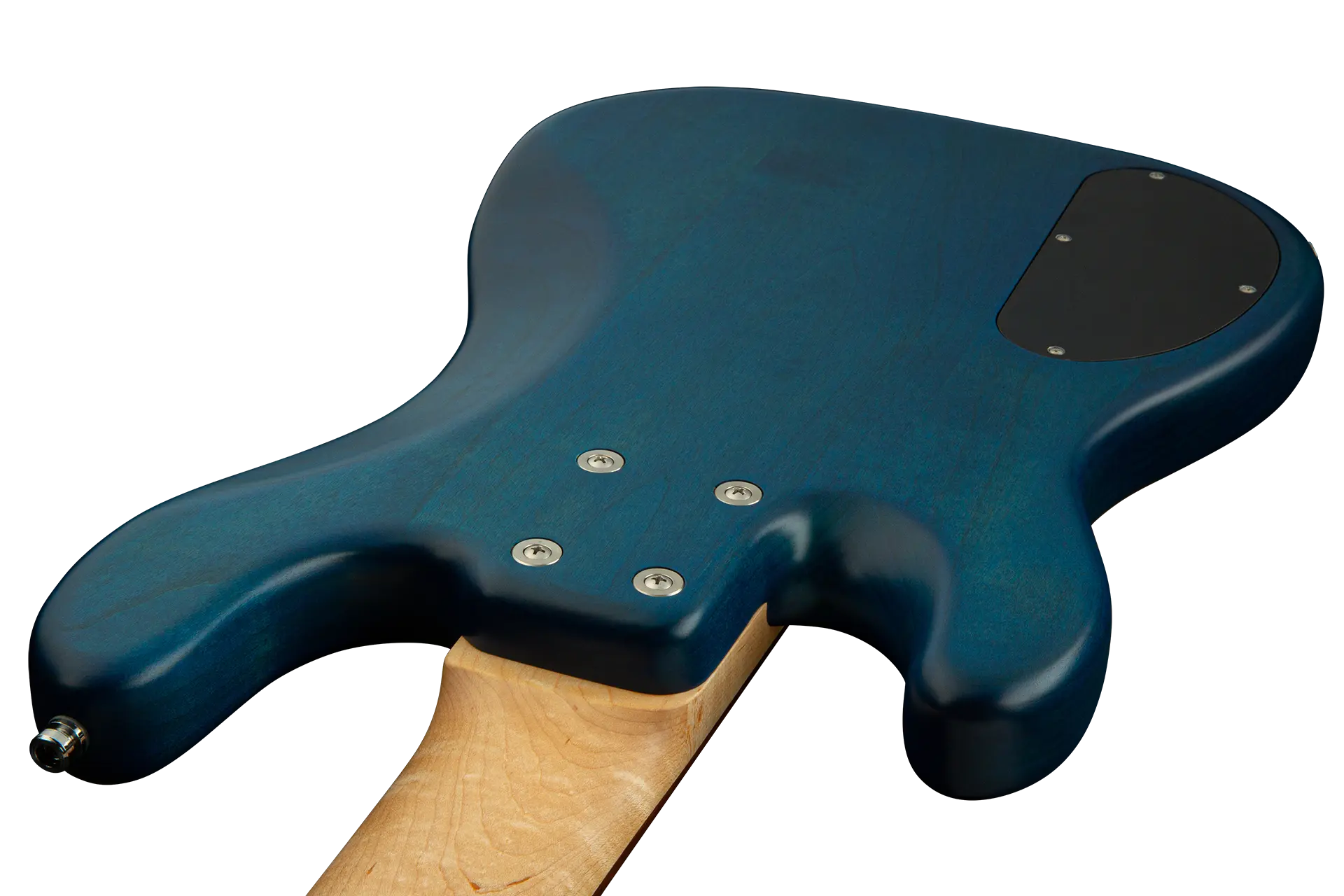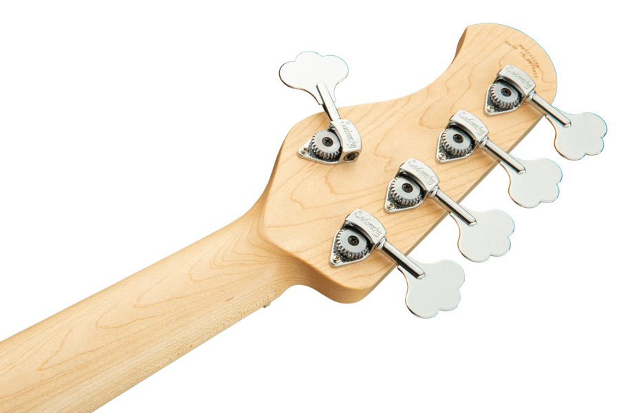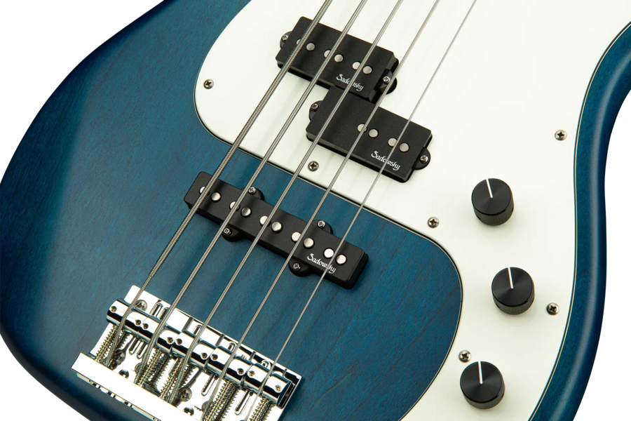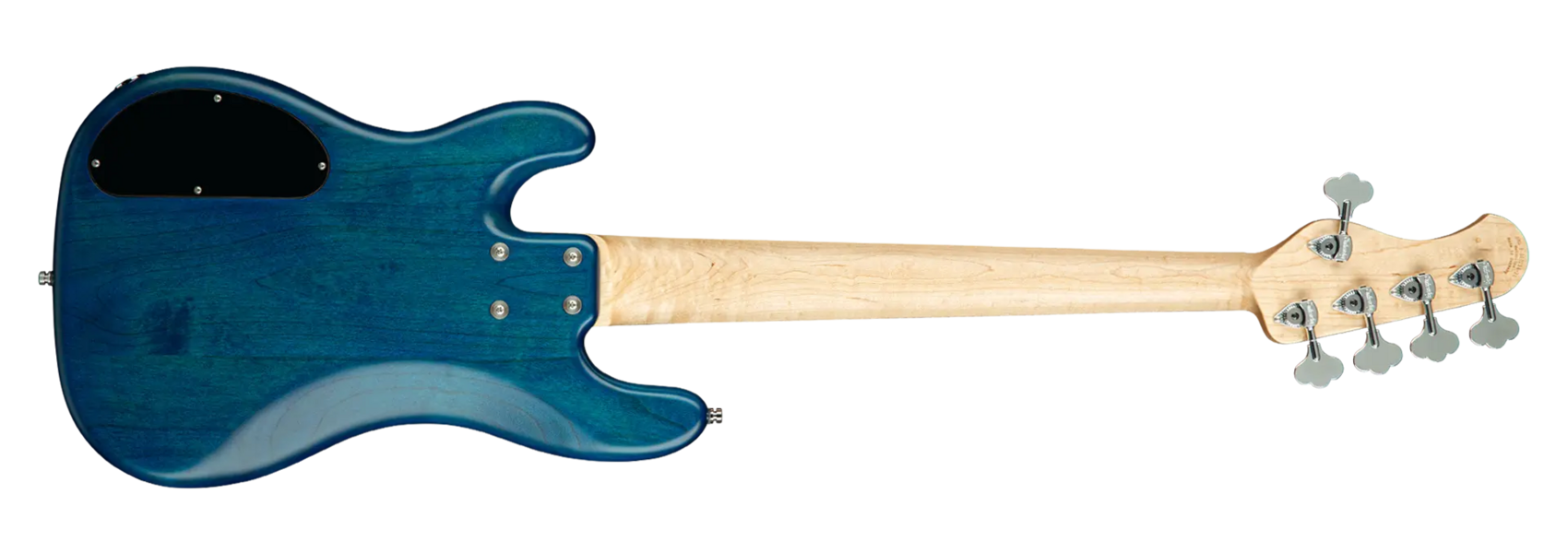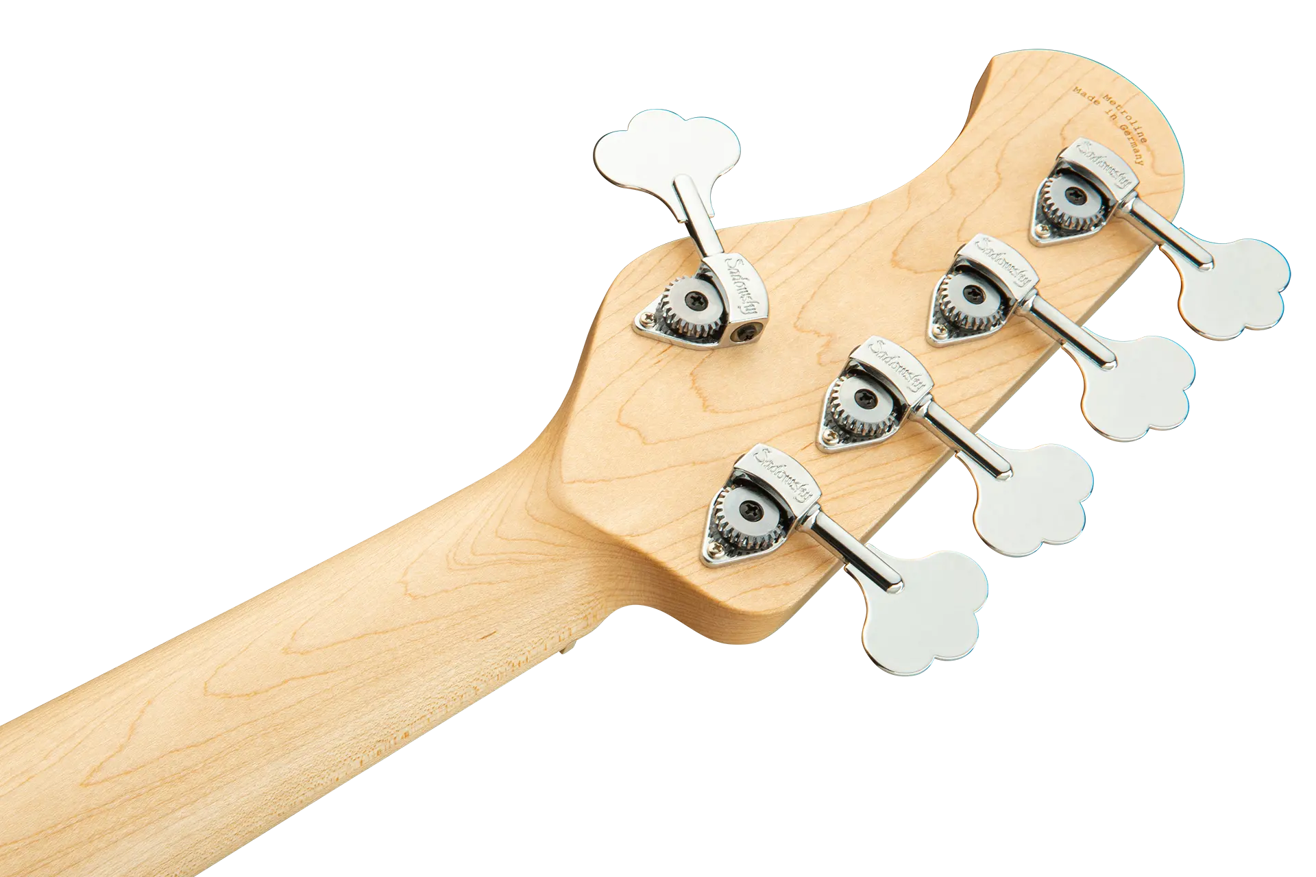Roger Sadowsky's goal was always to further improve an already very successful bass design by making a number of detailed improvements. Along with the electronics, which he developed by himself, he succeeded to raise the well-known P/J bass sound to a new level, so today you can speak of a typical Sadowsky tone: Never harsh or shrill sounding, with strong, powerful but never muddy bass, with present, but not too aggressive mids, and a sweet and airy treble range. This modern bass sound can also be found in the Sadowsky MetroLine 21-Fret Hybrid P/J line of basses. This 5-string bass, seen here in an Ocean Blue Transparent Satin finish, features a chambered P-Style body made of American Red Alder. The neck is made of Maple and features a Morado (Pau Ferro) fingerboard. Special features of this bass include Sadowsky P and J pickups, active electronics with true bypass, Vintage Tone Control, treble and bass boost. This bass also features light open gear Sadowsky tuners and the Sadowsky Quick String Release Bridge. Sadowsky MetroLine 21-Fret Hybrid P/J basses are made exclusively in Germany. The weight of this bass is never more than 8.9 lbs (4.0 kg). A good choice for players who want a lightweight bass that offers a modern bass sound.
