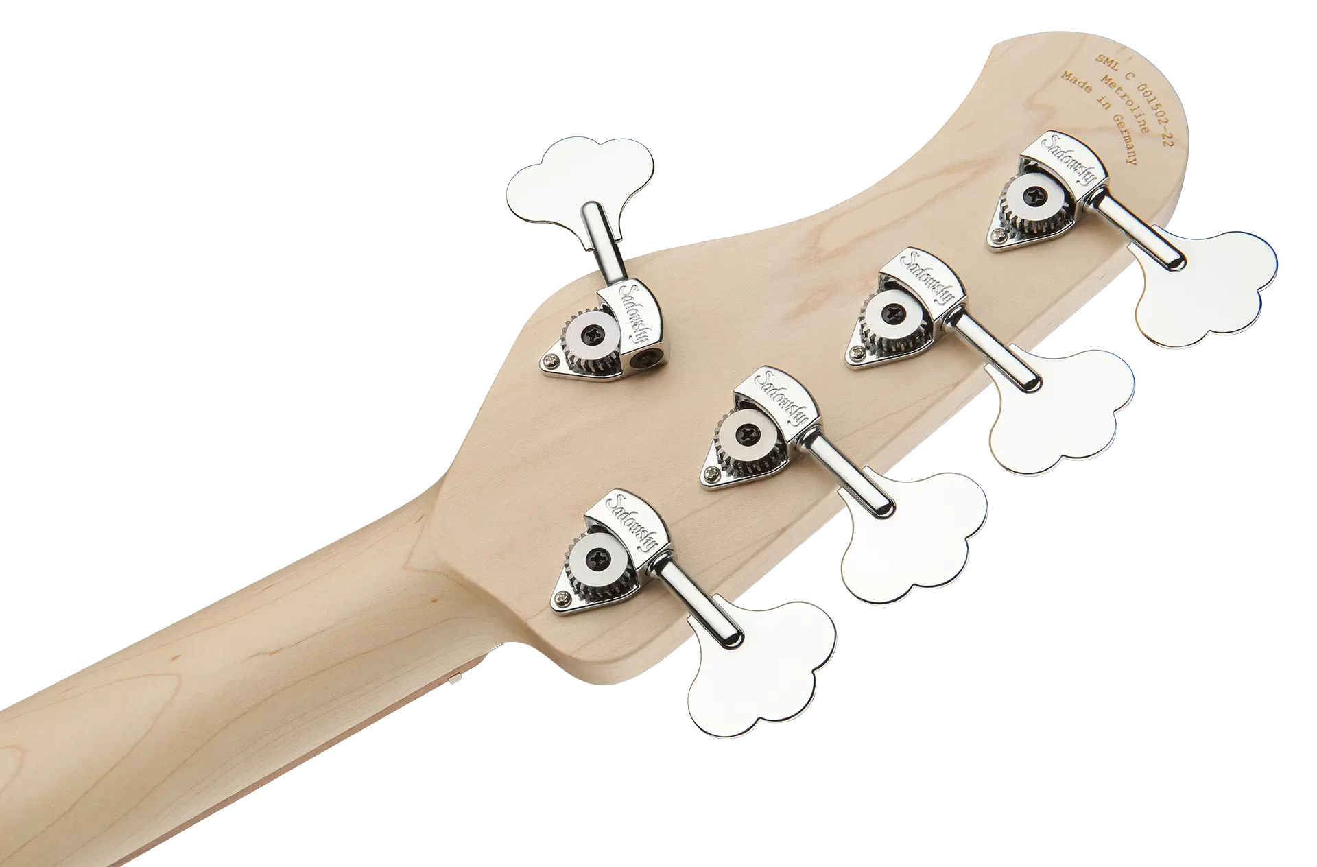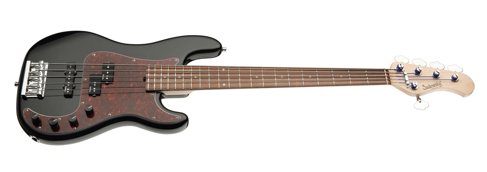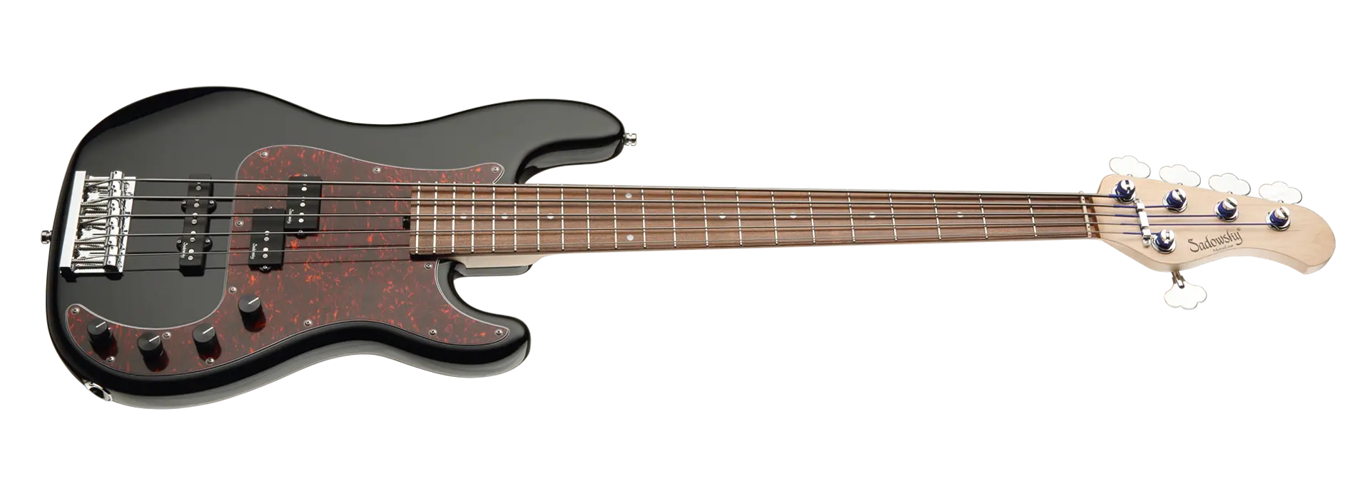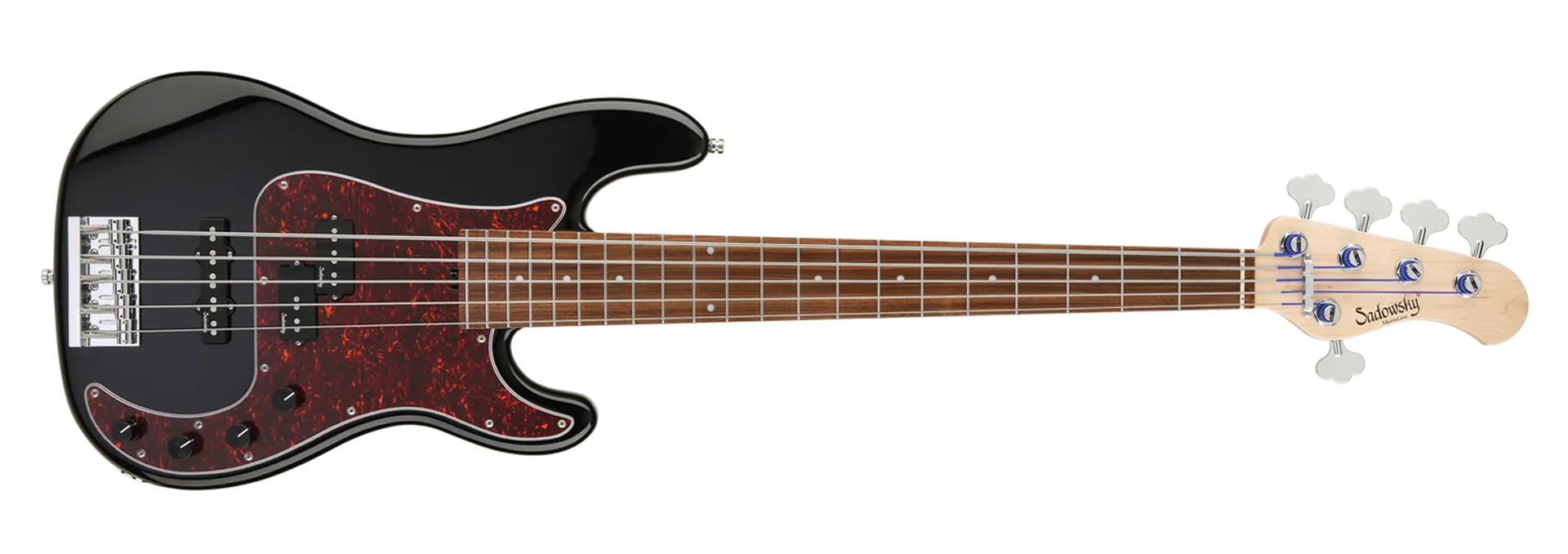 Roger Sadowsky's goal was always to further improve an already very successful bass design by making a number of detailed improvements. Along with the electronics, which he developed by himself, he succeeded to raise the well-known P/J bass sound to a new level, so today you can speak of a typical Sadowsky tone: Never harsh or shrill sounding, with strong, powerful but never muddy bass, with present, but not too aggressive mids, and a sweet and airy treble range. This modern bass sound can also be found in the Sadowsky MetroLine 21-Fret Hybrid P/J line of basses. This 5-string bass, seen here in a Solid Black High Polish finish, features a chambered P-Style body made of American Red Alder. The neck is made of Maple and features a Morado (Pau Ferro) fingerboard. Special features of this bass include Sadowsky P and J pickups, active electronics with true bypass, Vintage Tone Control, treble and bass boost. This bass also features light open gear Sadowsky tuners and the Sadowsky Quick String Release Bridge. Sadowsky MetroLine 21-Fret Hybrid P/J basses are made exclusively in Germany. The weight of this bass is never more than 8.9 lbs (4.0 kg). A good choice for players who want a lightweight bass that offers a modern bass sound.