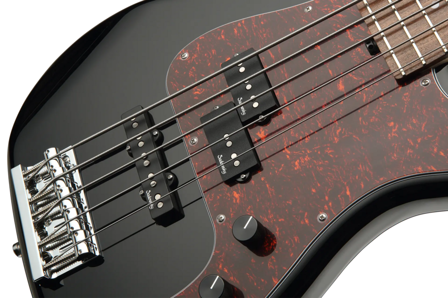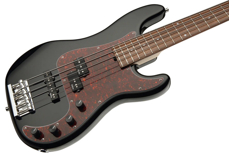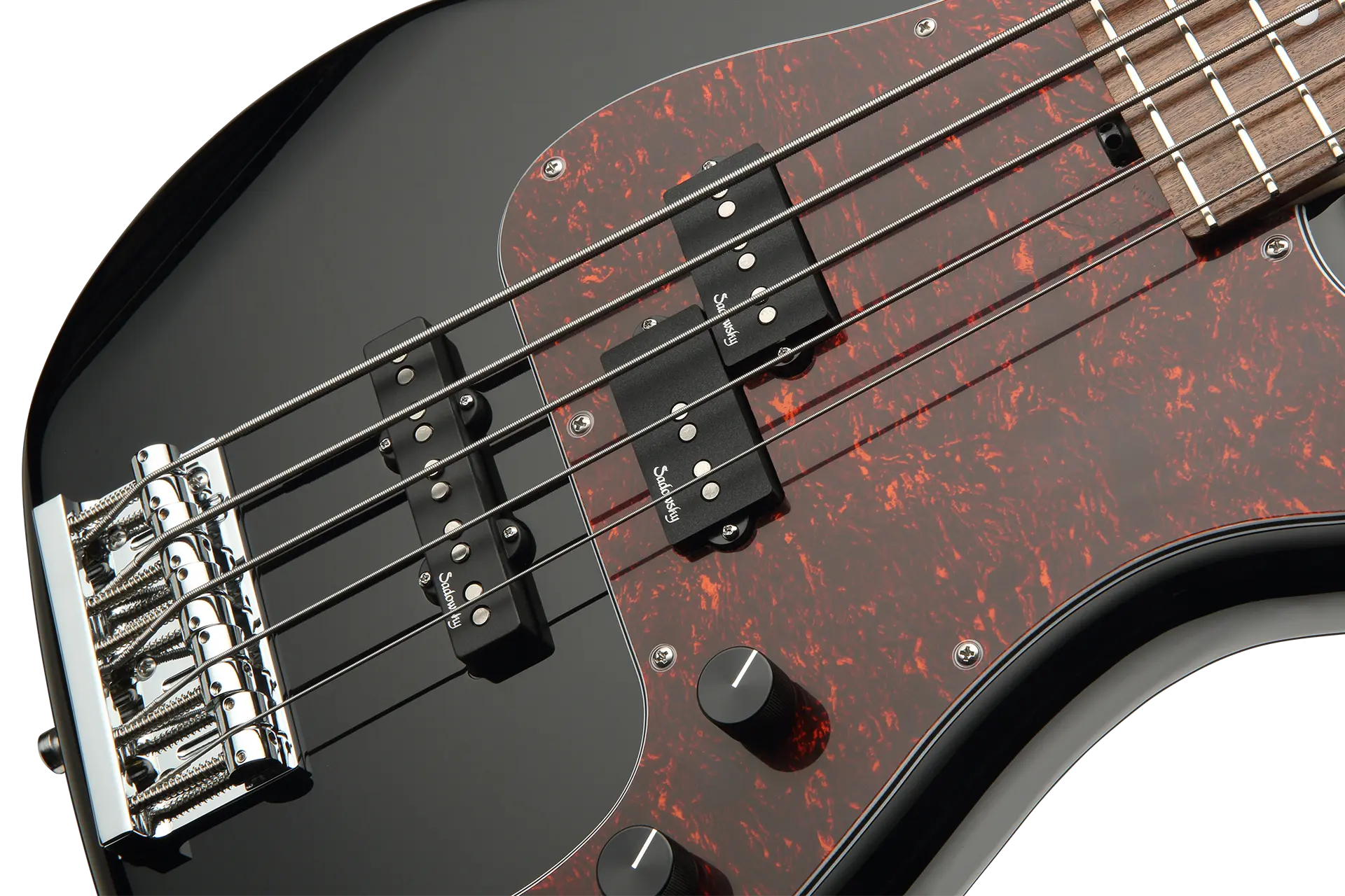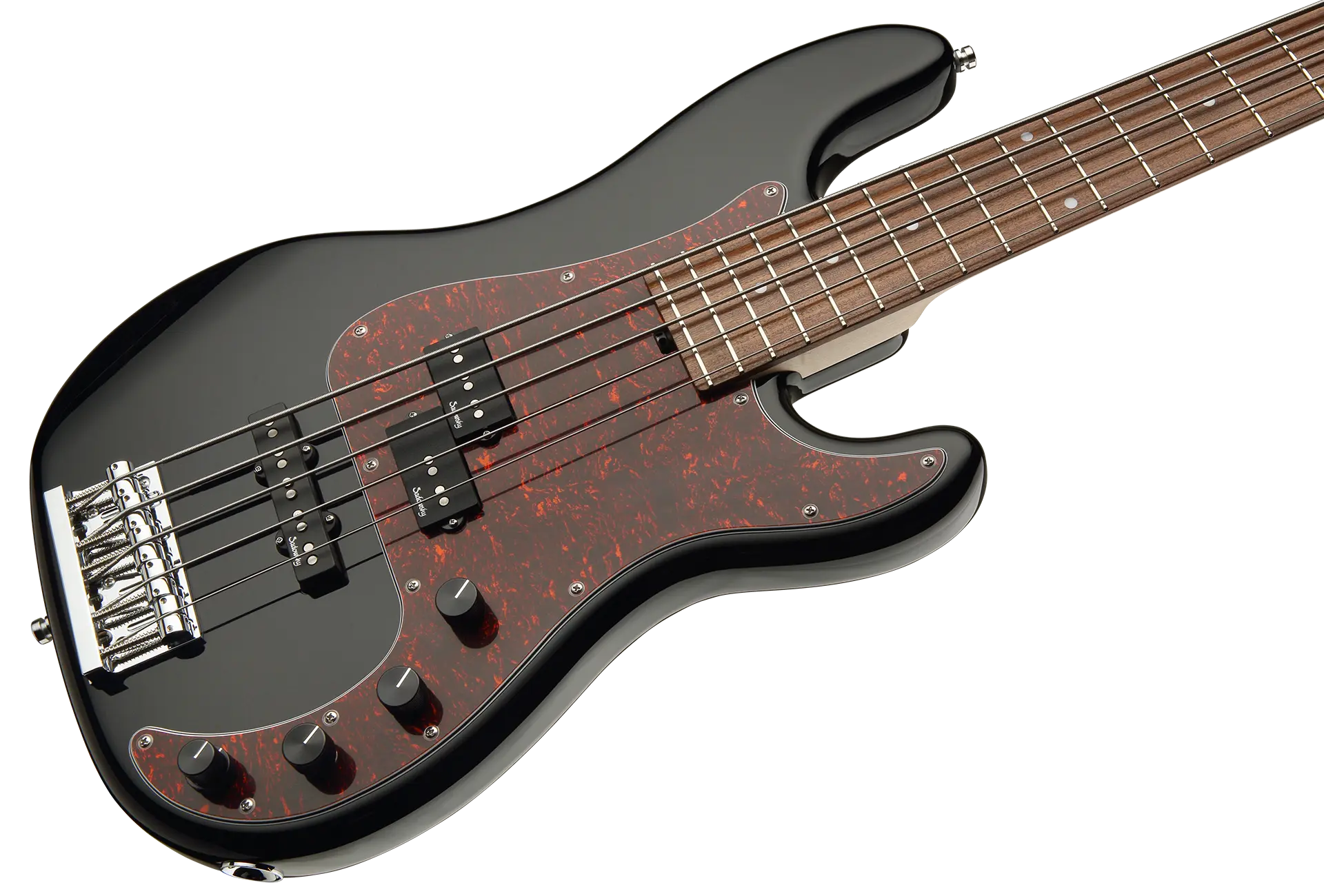 Roger Sadowsky's goal was always to further improve an already very successful bass design by making a number of detailed improvements. Along with the electronics, which he developed by himself, he succeeded to raise the well-known P/J bass sound to a new level, so today you can speak of a typical Sadowsky tone: Never harsh or shrill sounding, with strong, powerful but never muddy bass, with present, but not too aggressive mids, and a sweet and airy treble range. This modern bass sound can also be found in the Sadowsky MetroLine 21-Fret Hybrid P/J line of basses. This 5-string bass, seen here in a Solid Black High Polish finish, features a chambered P-Style body made of American Red Alder. The neck is made of Maple and features a Morado (Pau Ferro) fingerboard. Special features of this bass include Sadowsky P and J pickups, active electronics with true bypass, Vintage Tone Control, treble and bass boost. This bass also features light open gear Sadowsky tuners and the Sadowsky Quick String Release Bridge. Sadowsky MetroLine 21-Fret Hybrid P/J basses are made exclusively in Germany. The weight of this bass is never more than 8.9 lbs (4.0 kg). A good choice for players who want a lightweight bass that offers a modern bass sound.