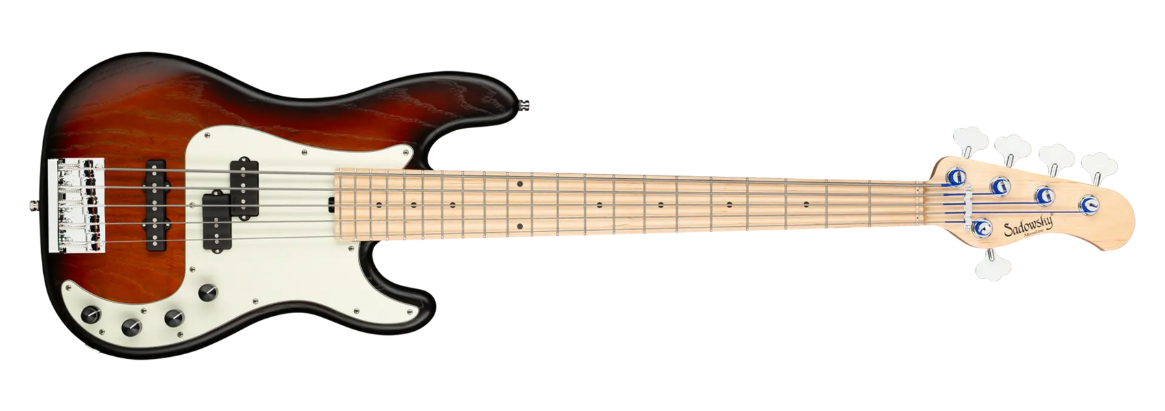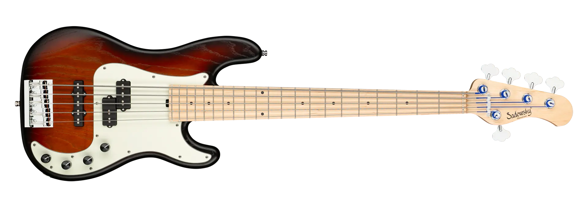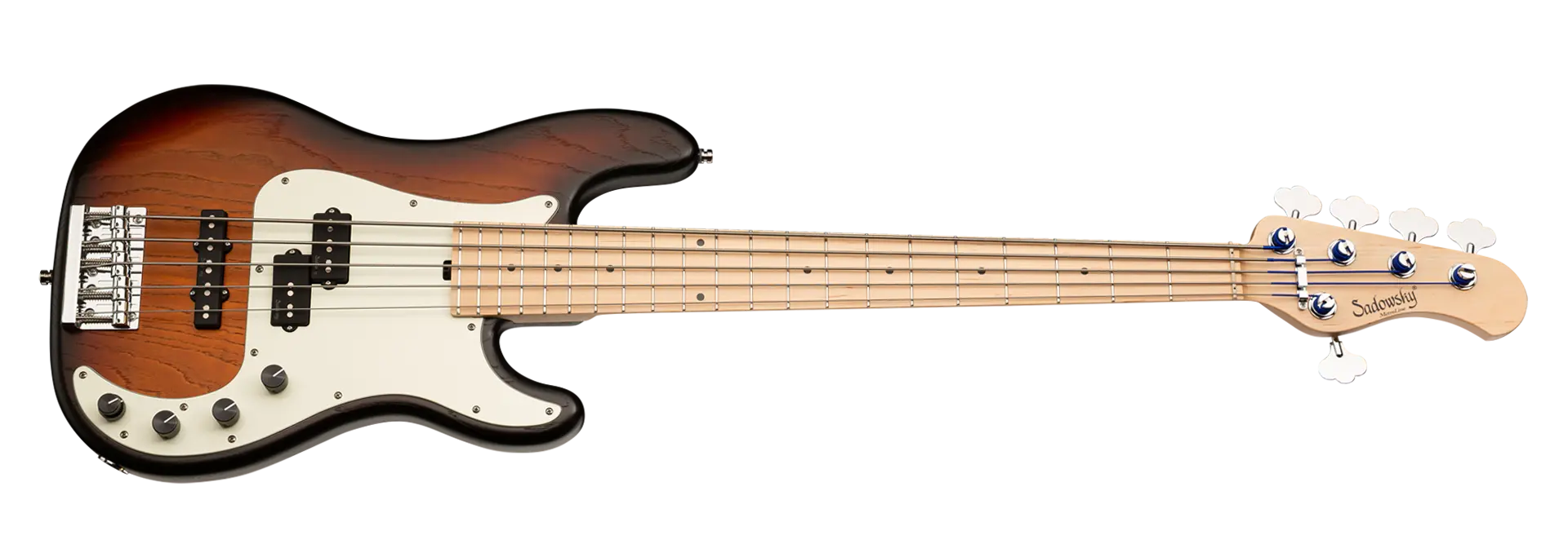 Roger Sadowsky's goal was always to further improve an already very successful bass design by making a number of detailed improvements. Along with the electronics, which he developed by himself, he succeeded to raise the well-known P/J bass sound to a new level, so today you can speak of a typical Sadowsky tone: Never harsh or shrill sounding, with strong, powerful but never muddy bass, with present, but not too aggressive mids, and a sweet and airy treble range. This modern bass sound can also be found in the Sadowsky MetroLine 21-Fret Hybrid P/J Solidbody line of basses. This 5-string solidbody bass, seen here in an Almond Sunburst Transparent Satin finish, features a P-Style body made of solid American Swamp Ash.The neck is made of Maple and features a Maple fingerboard. Special features of this bass include Sadowsky P and J pickups, active electronics with true bypass, Vintage Tone Control, treble and bass boost. This bass also features light open gear Sadowsky tuners and the Sadowsky Quick String Release Bridge. Sadowsky MetroLine 21-Fret Hybrid P/J Solidbody basses are made exclusively in Germany. The weight of this bass is never more than 8.9 lbs (4.0 kg). A good choice for players who want a lightweight bass that offers a modern bass sound.
