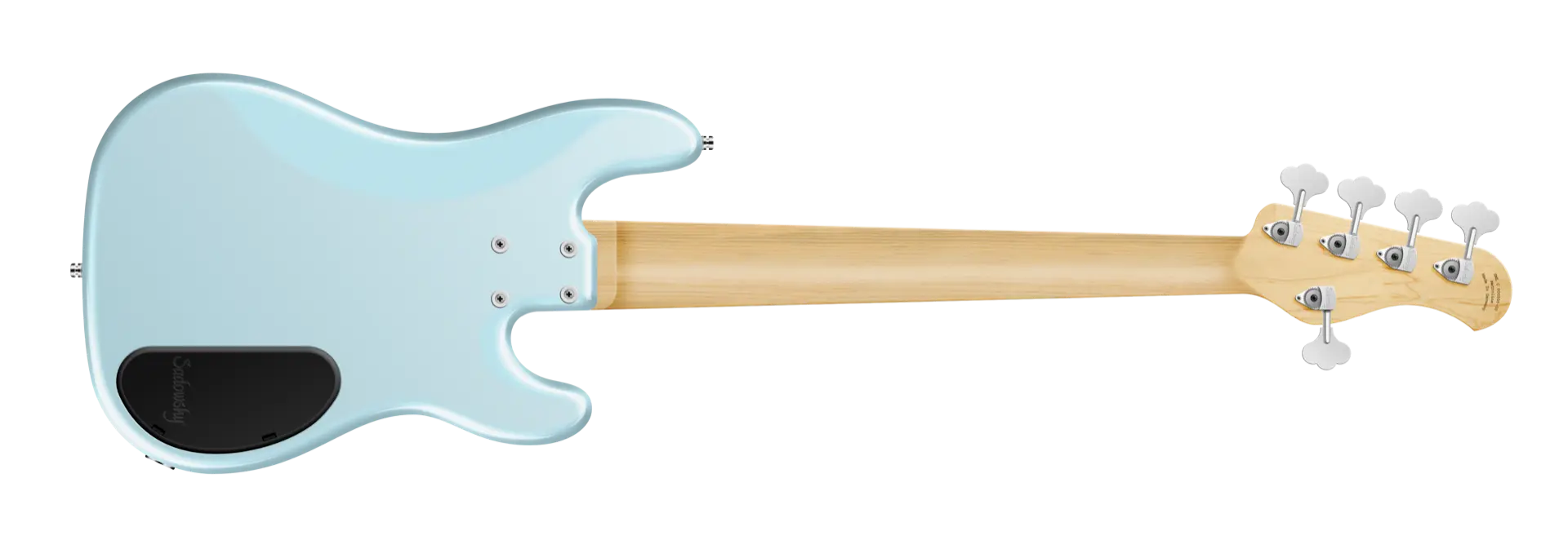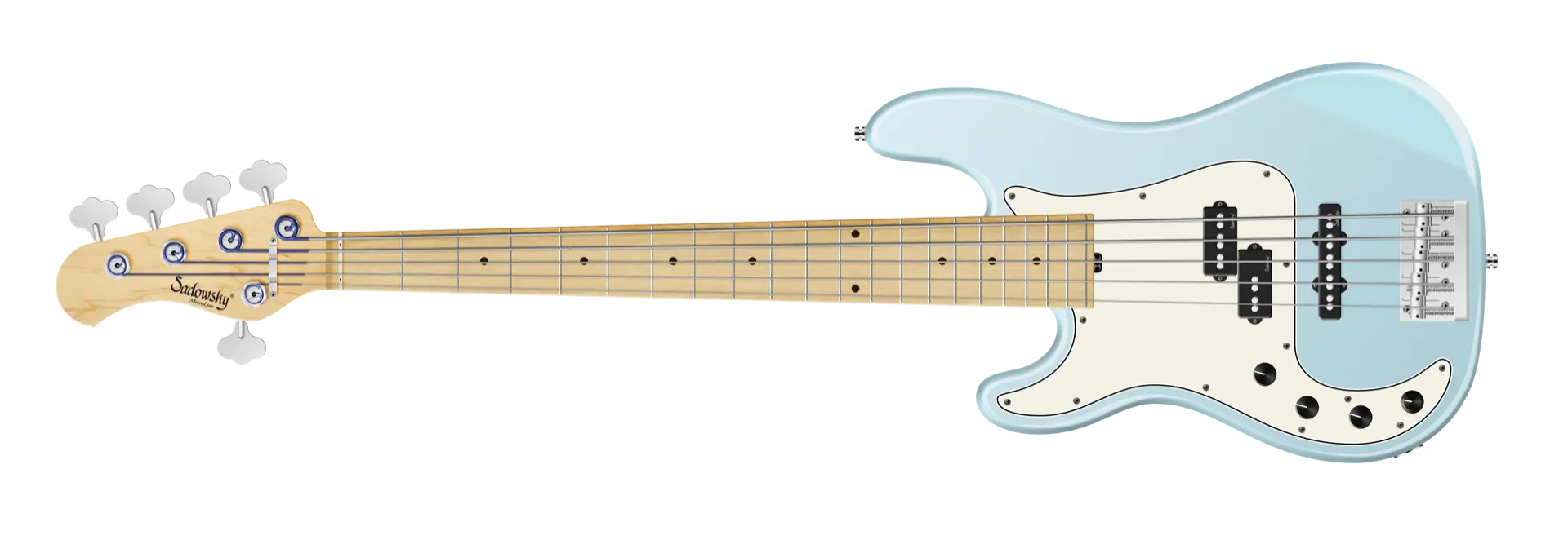 Roger Sadowsky's goal was always to further improve an already very successful bass design by making a number of detailed improvements. Along with the electronics, which he developed by himself, he succeeded to raise the well-known P/J bass sound to a new level, so today you can speak of a typical Sadowsky tone: Never harsh or shrill sounding, with strong, powerful but never muddy bass, with present, but not too aggressive mids, and a sweet and airy treble range. This modern bass sound can also be found in the Sadowsky MetroLine 21-Fret Hybrid P/J Solidbody line of basses. This 5-string solidbody left-hand bass, seen here in a Solid Ice Blue Metallic Satin finish, features a P-Style body made of solid American Swamp Ash.The neck is made of Maple and features a Maple fingerboard. Special features of this bass include Sadowsky P and J pickups, active electronics with true bypass, Vintage Tone Control, treble and bass boost. This bass also features light open gear Sadowsky tuners and the Sadowsky Quick String Release Bridge. Sadowsky MetroLine 21-Fret Hybrid P/J Solidbody basses are made exclusively in Germany. The weight of this bass is never more than 8.9 lbs (4.0 kg). A good choice for players who want a lightweight bass that offers a modern bass sound.