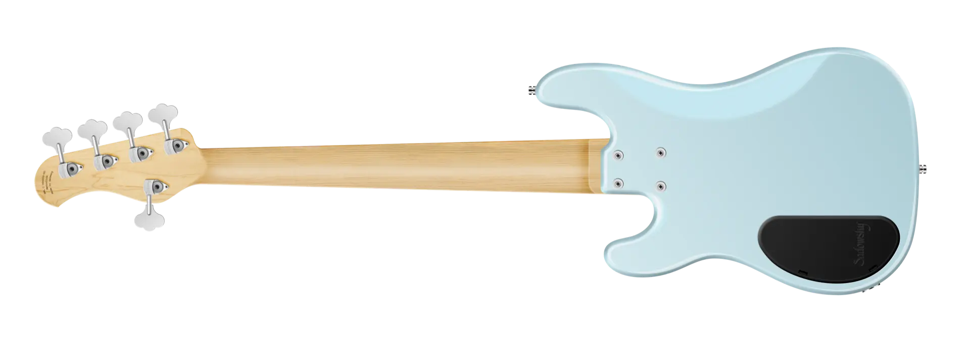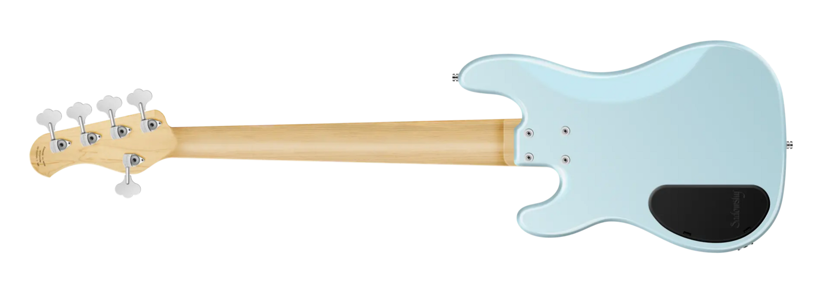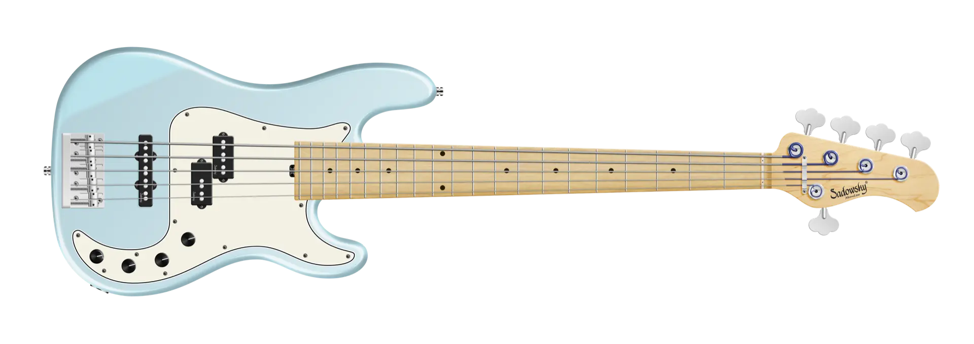 Roger Sadowsky's goal was always to further improve an already very successful bass design by making a number of detailed improvements. Along with the electronics, which he developed by himself, he succeeded to raise the well-known P/J bass sound to a new level, so today you can speak of a typical Sadowsky tone: Never harsh or shrill sounding, with strong, powerful but never muddy bass, with present, but not too aggressive mids, and a sweet and airy treble range. This modern bass sound can also be found in the Sadowsky MetroLine 21-Fret Hybrid P/J Solidbody line of basses. This 5-string solidbody bass, seen here in a Solid Ice Blue Metallic Satin finish, features a P-Style body made of solid American Swamp Ash.The neck is made of Maple and features a Maple fingerboard. Special features of this bass include Sadowsky P and J pickups, active electronics with true bypass, Vintage Tone Control, treble and bass boost. This bass also features light open gear Sadowsky tuners and the Sadowsky Quick String Release Bridge. Sadowsky MetroLine 21-Fret Hybrid P/J Solidbody basses are made exclusively in Germany. The weight of this bass is never more than 8.9 lbs (4.0 kg). A good choice for players who want a lightweight bass that offers a modern bass sound.