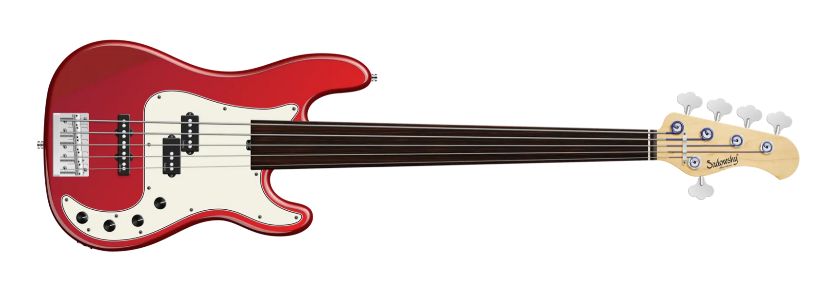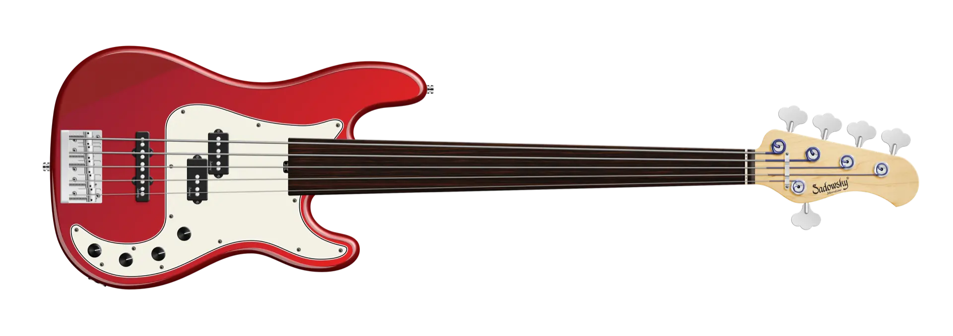 Roger Sadowsky's goal was always to further improve an already very successful bass design by making a number of detailed improvements. Along with the electronics, which he developed by himself, he succeeded to raise the well-known P/J bass sound to a new level, so today you can speak of a typical Sadowsky tone: Never harsh or shrill sounding, with strong, powerful but never muddy bass, with present, but not too aggressive mids, and a sweet and airy treble range. This modern bass sound can also be found in the Sadowsky MetroLine 21-Fret Hybrid P/J line of basses. This 5-string fretless bass, seen here in a Solid Candy Apple Red Metallic High Polish finish, features a chambered P-Style body made of American Swamp Ash. The neck is made of Maple and features a Tigerstripe Ebony fingerboard. Special features of this bass include Sadowsky P and J pickups, active electronics with true bypass, Vintage Tone Control, treble and bass boost. This bass also features light open gear Sadowsky tuners and the Sadowsky Quick String Release Bridge. Sadowsky MetroLine 21-Fret Hybrid P/J basses are made exclusively in Germany. The weight of this bass is never more than 8.9 lbs (4.0 kg). A good choice for players who want a lightweight bass that offers a modern bass sound.