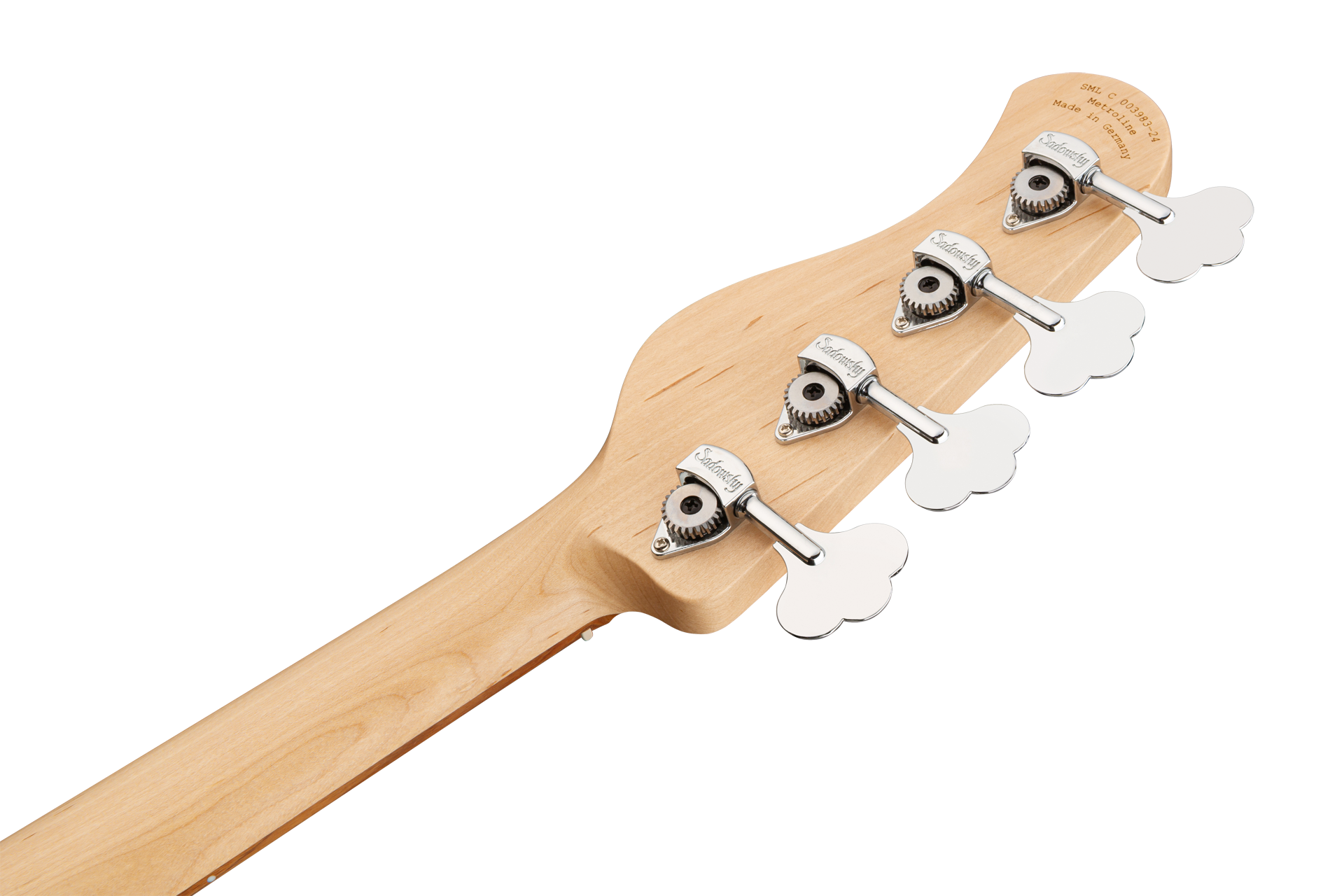 The Sadowsky MetroLine 24-Fret Modern Bass is perfect for any player looking for a bass with modern looks and that famous Sadowsky tone: Never harsh or shrill sounding, with strong, powerful but never muddy bass, with present, but not too aggressive mids, and a sweet and airy treble range. This 4-string bass has a chambered American Red Alder body. Seen here in an Ocean Blue Transparent Satin finish, the body shape is sleek and undersized with deeper cutaways for better playability and a full two octave note range. The neck is made from American Maple and has a Morado (Pau Ferro) fretboard with 24 nickel silver frets. This bass is fitted with two passive Sadowsky Soapbar pickups, both in a modern position, and has active electronics that offer true bypass, Vintage Tone Control, as well as treble and bass boost. Hardware includes Sadowsky light open gear tuners and a Sadowsky Quick String Release bridge. Each Sadowsky MetroLine 24-Fret Modern Bass is made exclusively in our workshop in Germany and weighs no more than 8.9 lbs (4.0 kg). A good choice for bass players who are seaching for a light, modern looking bass with that special modern Sadowsky sound.
