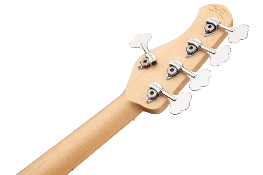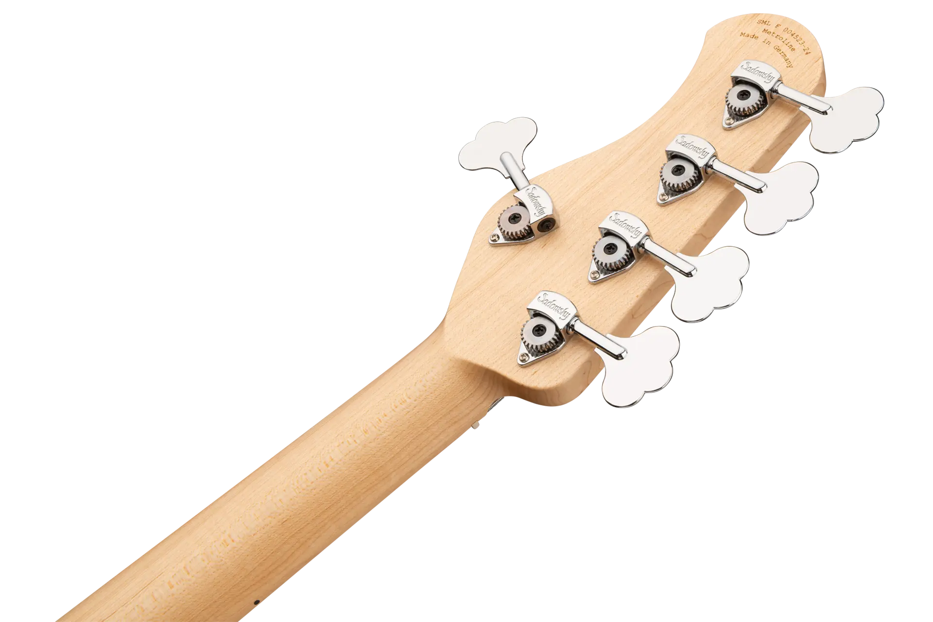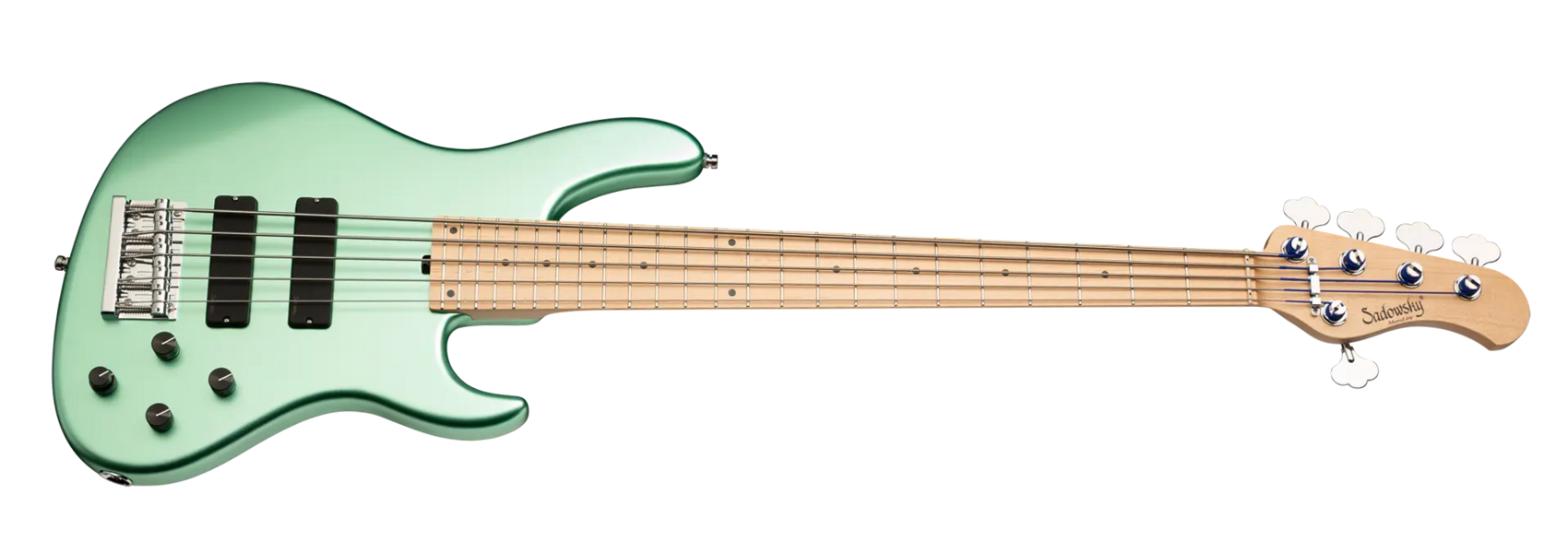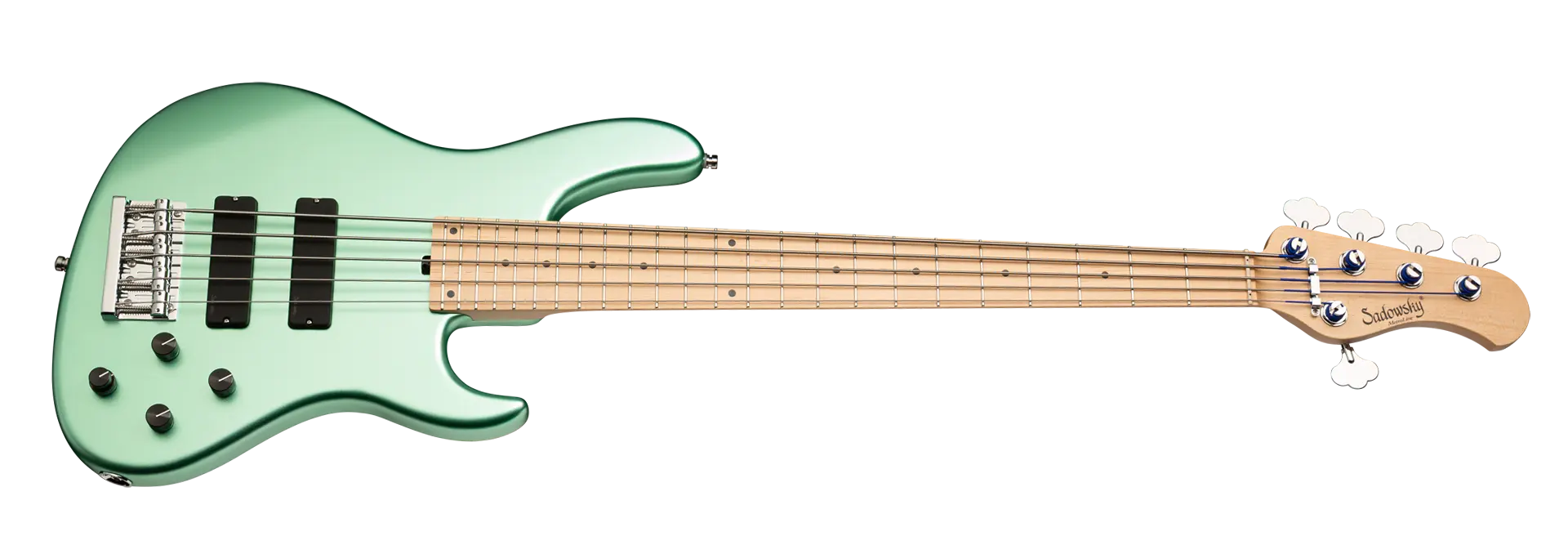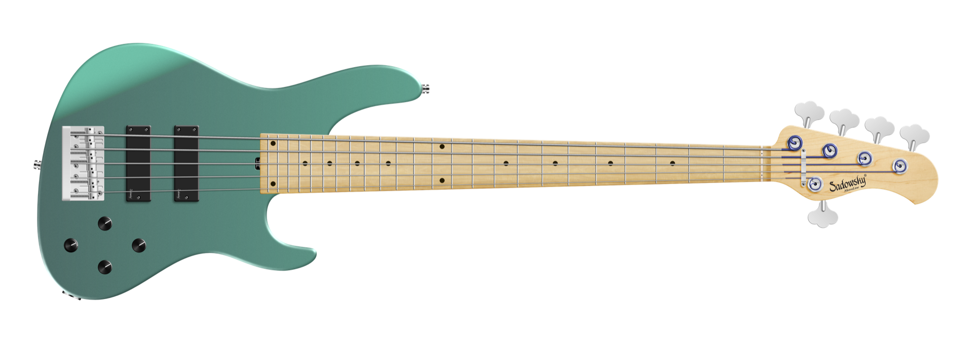 The Sadowsky MetroLine 24-Fret Modern Bass is perfect for any player looking for a bass with modern looks and that famous Sadowsky tone: Never harsh or shrill sounding, with strong, powerful but never muddy bass, with present, but not too aggressive mids, and a sweet and airy treble range. This 5-string bass has a chambered Swamp Ash body. Seen here in a Solid Sage Green Metallic Satin finish, the body shape is sleek and undersized with deeper cutaways for better playability and a full two octave note range. The neck is made from American Maple and has an American Maple fretboard with 24 nickel silver frets. This bass is fitted with two passive Sadowsky Soapbar pickups, both in a modern position, and has active electronics that offer true bypass, Vintage Tone Control, as well as treble and bass boost. Hardware includes Sadowsky light open gear tuners and a Sadowsky Quick String Release bridge. Each Sadowsky MetroLine 24-Fret Modern Bass is made exclusively in our workshop in Germany and weighs no more than 8.9 lbs (4.0 kg). A good choice for bass players who are seaching for a light, modern looking bass with that special modern Sadowsky sound.