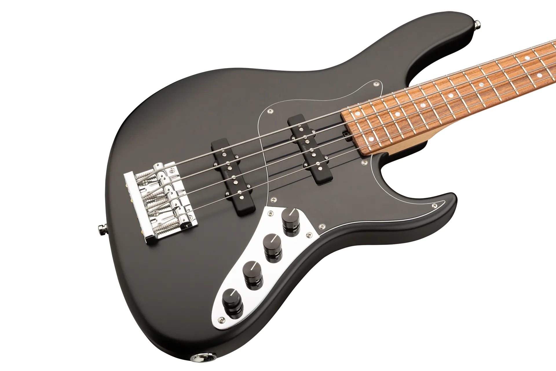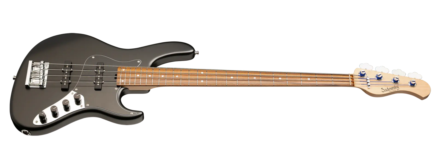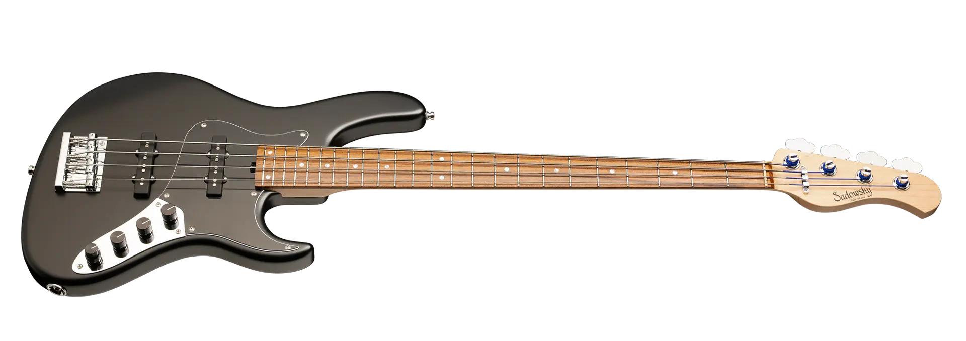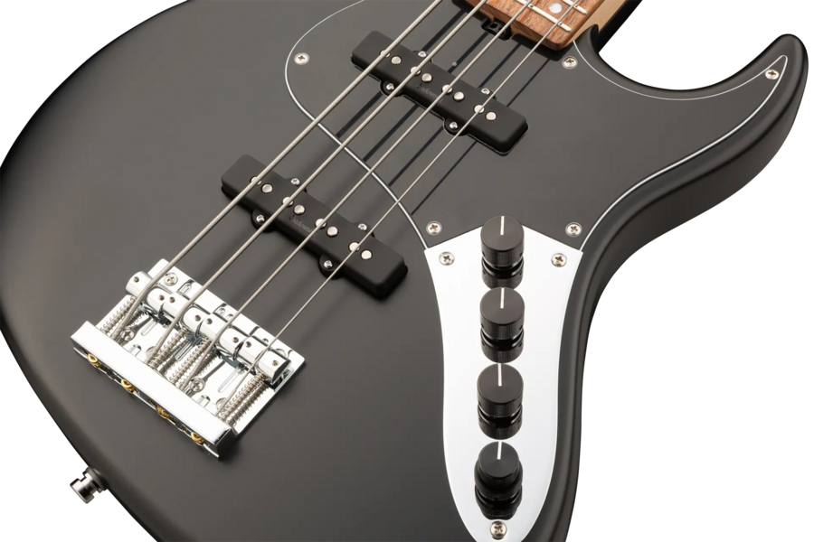 The Sadowsky MetroLine 24-Fret Vintage J/J Bass pays tribute to Roger Sadowsky’s ability to greatly improve an already successful bass design via a number of detailed changes resulting in that special Sadowsky bass tone: Never harsh or shrill sounding, with strong, powerful but never muddy bass. Present, but not too aggressive mids, and a sweet and airy treble. This 4-string bass features a sleek, undersized chambered J-Style body made of American Red Alder that is finished in a Solid Black Satin finish. It is fitted with Sadowsky J-Style pickups and active electronics with true bypass, Vintage Tone Control and treble / bass boost. The American Maple neck has a Morado (Pau Ferro) fretboard with 24 nickel silver frets. Hardware includes ultra-light Sadowsky tuners and the special Sadowsky Quick String Release bridge. Made exclusively in Germany, a Sadowsky MetroLine 24-Fret Vintage J/J Bass will never weigh more than 8.9 lbs / 4.0 kg. It’s an excellent choice for bass players who are looking for a lightweight instrument with a modern bass sound.
