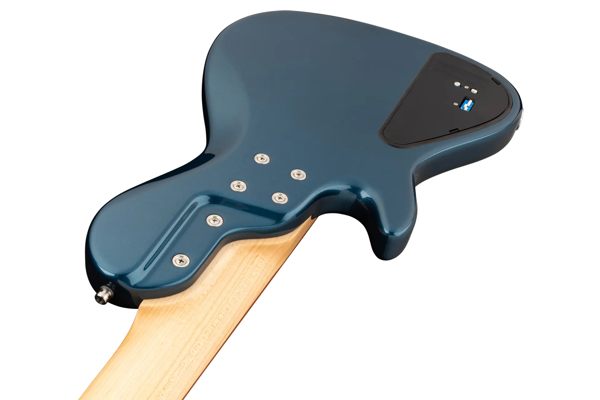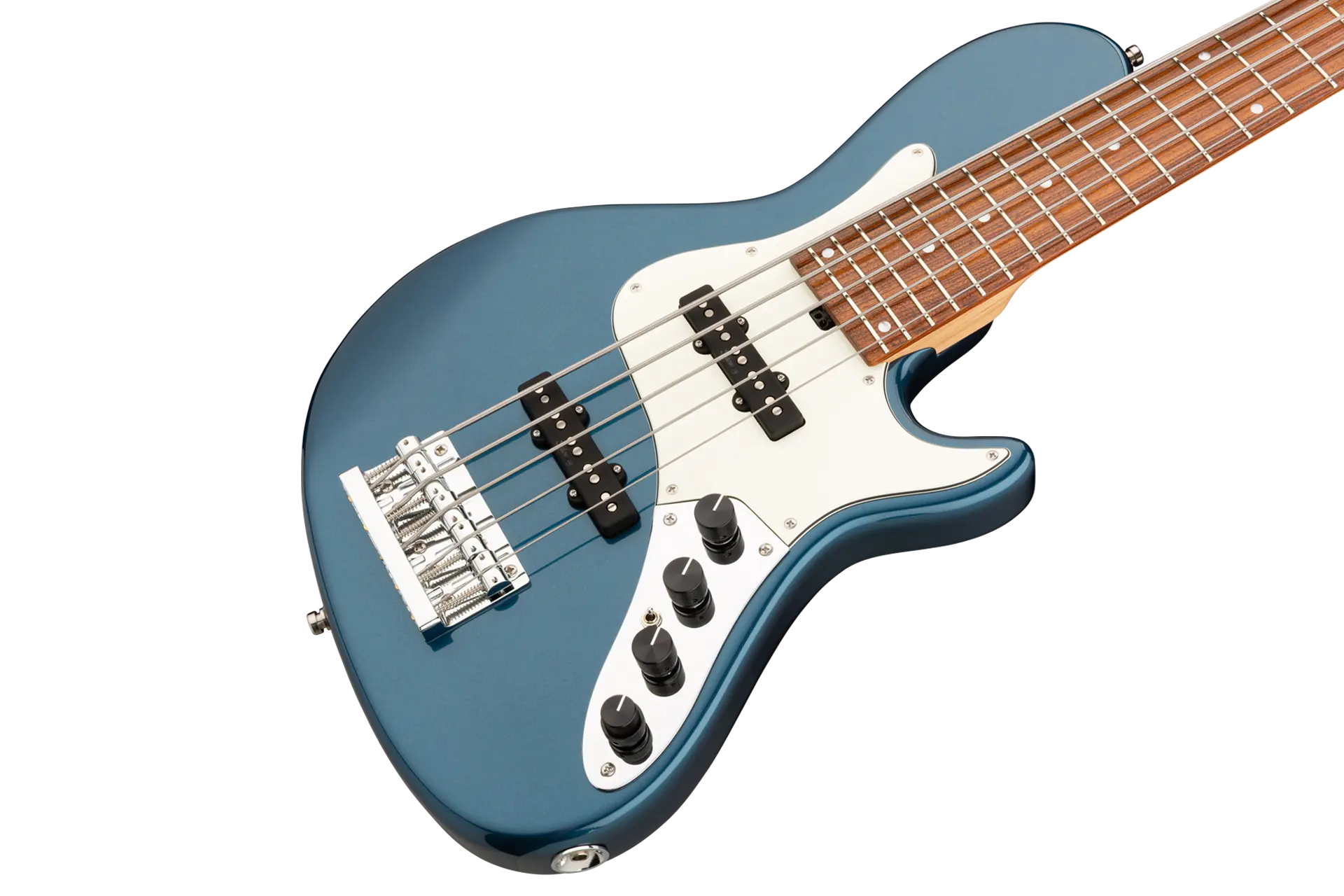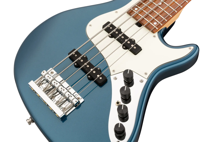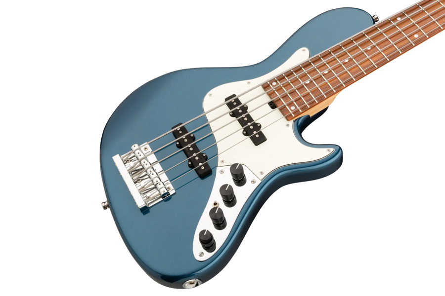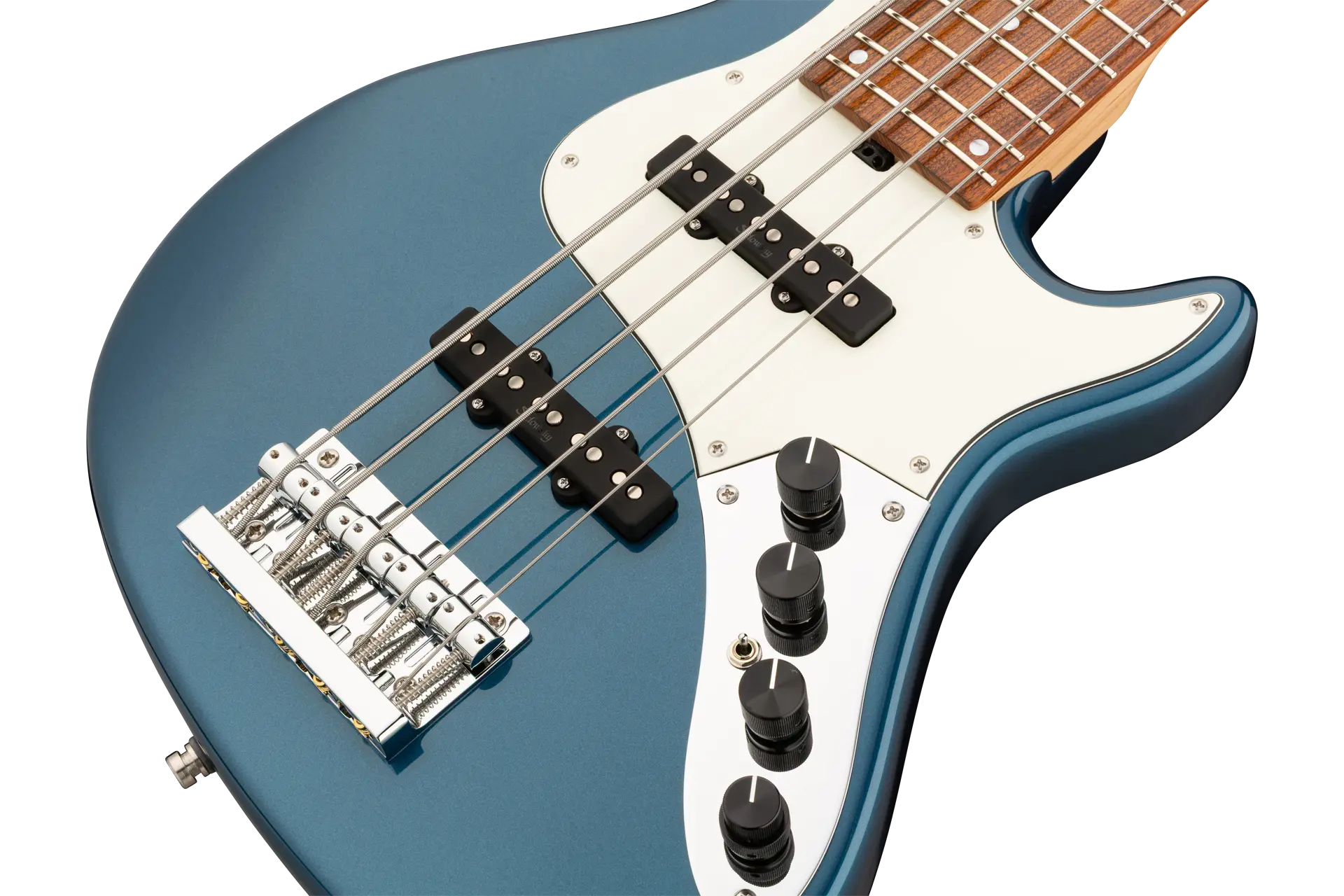The Sadowsky MetroLine 24-Fret Vintage Single Cut 5-string bass features a sleek, undersized single-cut style body made of chambered American Red Alder with a Solid Dark Lake Placid Blue Metallic High Polish finish. The neck is made of American Maple and features a Morado (Pau Ferro) fingerboard. Special features on this bass include Sadowsky J-Style pickups as well as Roger's famous electronics featuring a preamp with switchable mid-boost and trim pot (choice of 500 Hz or 800 Hz, wide or narrow bandwidth) Vintage Tone Control and preamp bypass. Controls include Volume, Balance, VTC (P/P), Treble and Bass. The hardware includes a Sadowsky Quick String Release Bridge and light open gear Sadowsky tuners. Made exclusively in Germany, a Sadowsky MetroLine 24-Fret Vintage Single Cut bass never weighs more than 8.9 lbs (4.0 kg). It’s a great choice for players who want a lightweight single-cut bass with that famous Sadowsky tone: strong, powerful bass that is never muddy. Mids that are present but not too aggressive and a sweet and airy treble range.