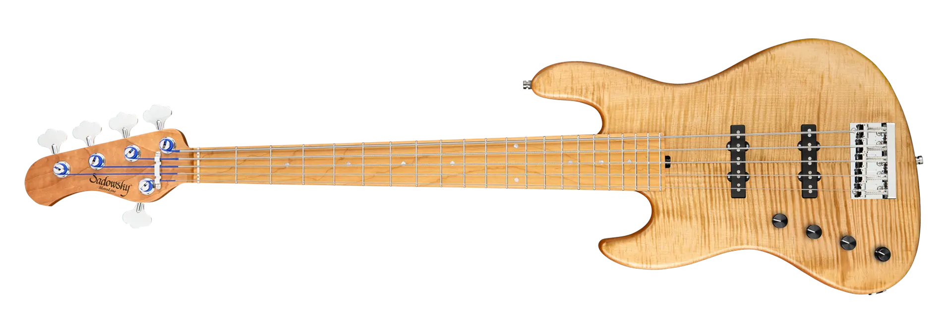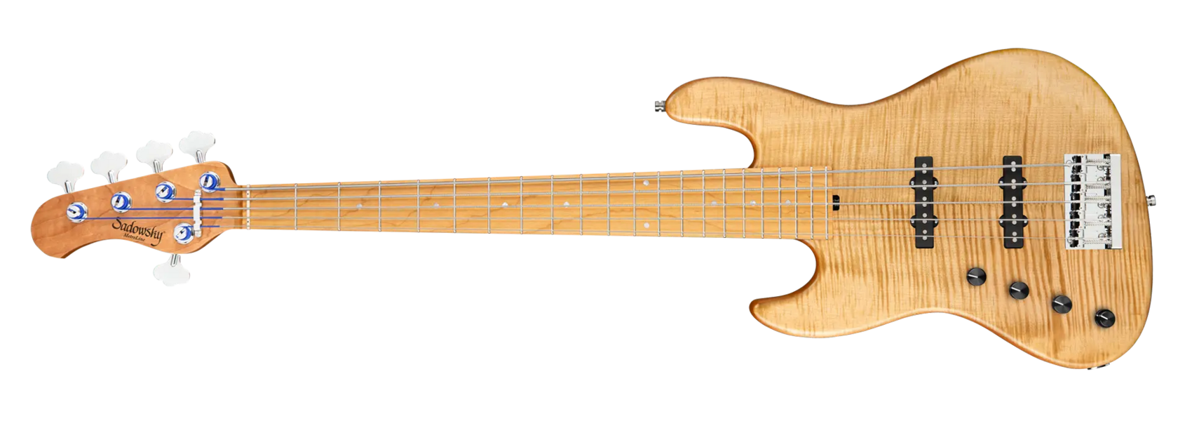 The Sadowsky MetroLine Deluxe 21-Fret Standard J/J bass brings a new aspect to an already fantastic Sadowsky bass: a light, chambered Okoume wood body with a gorgeous flamed maple top and a roasted maple neck. This bass not only looks fantastic, it also plays beautifully! In terms of sound, the famous Sadowsky electronics give you that special Sadowsky tone: Never harsh or shrill sounding, with strong, powerful (but never muddy!) bass, mids that are present while not too aggressive, and a sweet and airy treble range. This 5-string left-hand version has a sleek, undersized J-Style body shape and is finished in a Vintage Tinted Natural Transparent Satin finish and has a Roasted American Maple neck with a Roasted American Maple fingerboard. Special features of this bass include two hum-cancelling Sadowsky J-Style pickups, active electronics with true bypass, treble and bass boost and Vintage Tone Control. It also features light open gear Sadowsky tuners and a Sadowsky Quick String Release Bridge. Made exclusively in our workshop in Germany, this bass weighs never more than 8.9 lbs (4.0 kg). A great choice for bass players looking for a beautiful and lightweight bass that offers a modern bass sound.